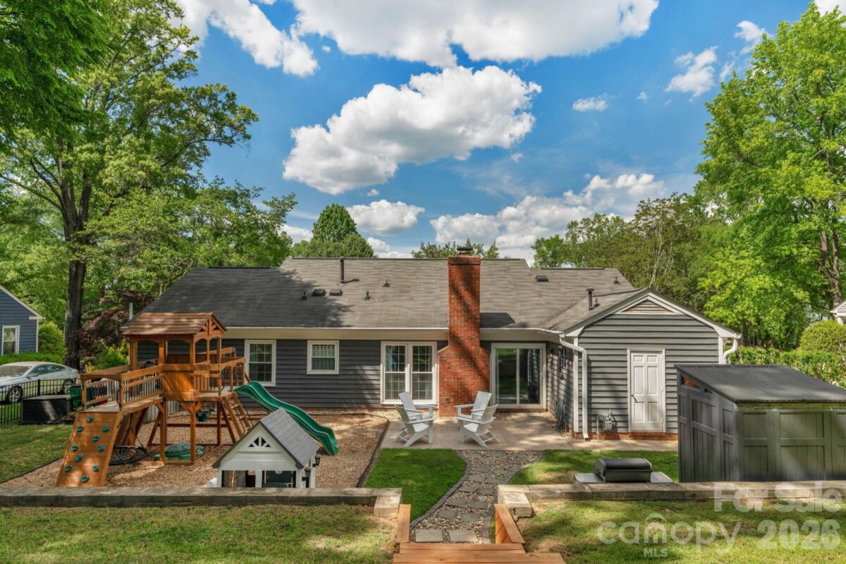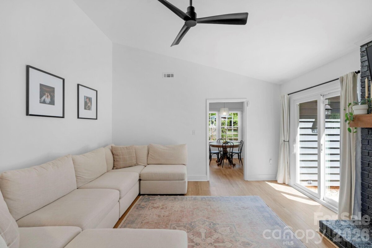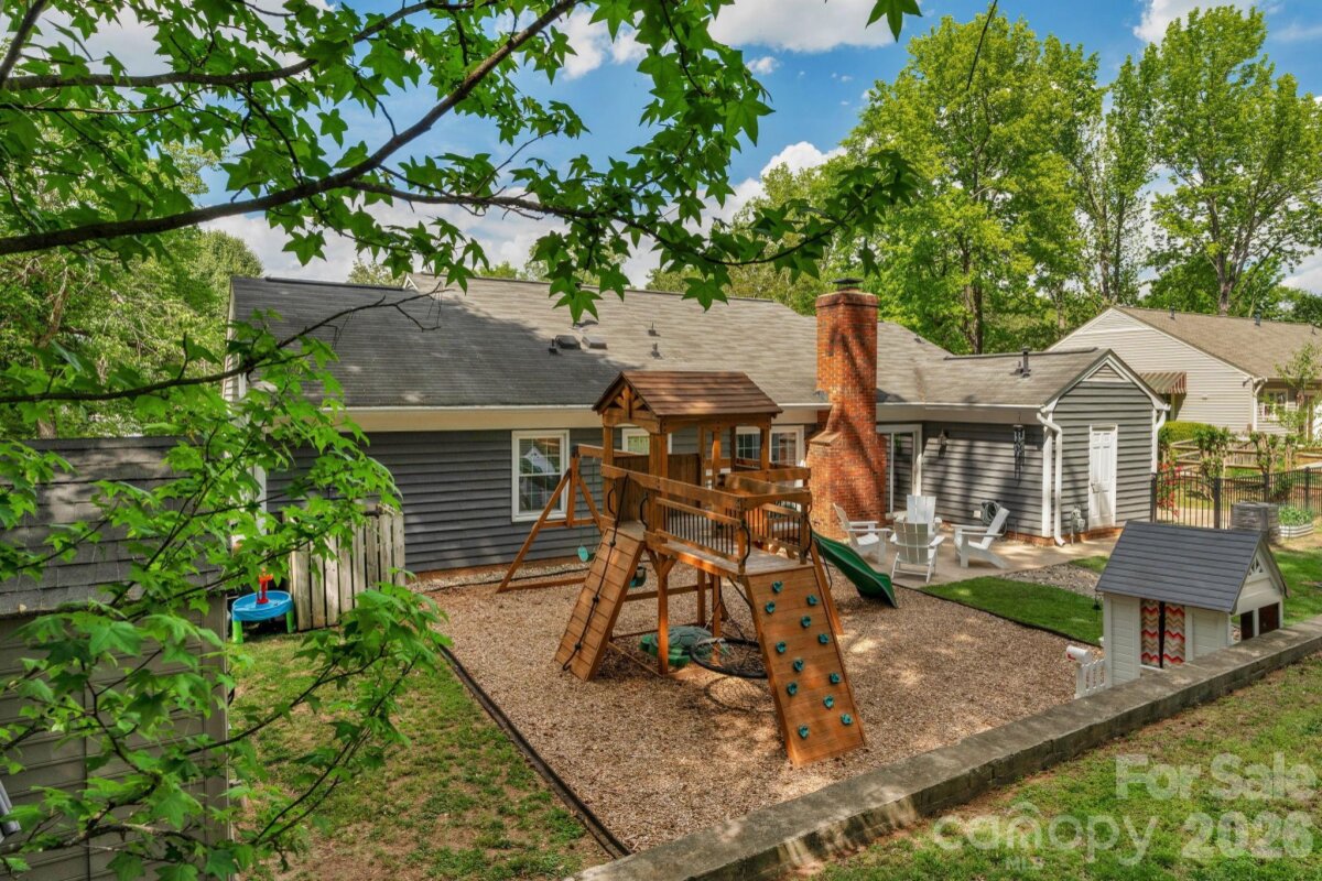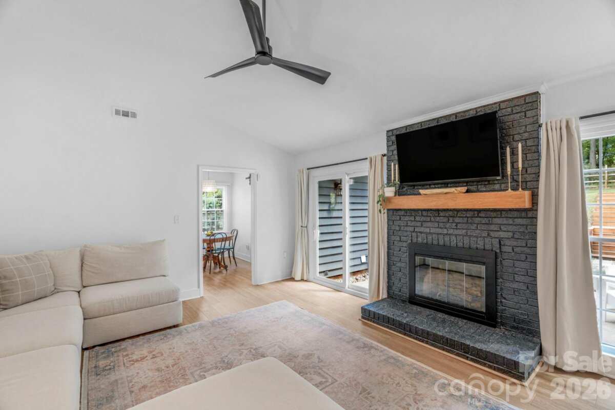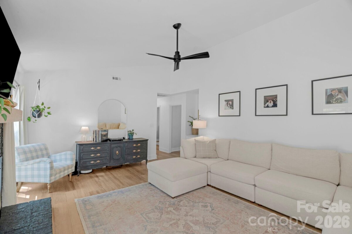 Classic brick-accent ranch with inviting covered front porch and easy one-level living, set on a private, tree-lined lot in Raeburn. Inside, the layout flows naturally with updated LVP flooring from the living and dining areas into a spacious family room with vaulted ceiling and fireplace, creating a comfortable central gathering space. The kitchen features white cabinetry, stainless appliances, and a casual breakfast area, with nearby mudroom/laundry offering additional cabinets for storage and function. The primary suite is tucked on its own side of the home with an en-suite bath and walk-in closet, while two secondary bedrooms share a full bath down the hall. Both bathrooms feature update vanities, flooring and lighting. In the back yard, the home opens to a patio and fully fenced yard with play space and multiple sheds for storage, offering both privacy and flexibility for outdoor living. Residents will also enjoy fantastic neighborhood amenities such as a pool, sports courts, playgrounds, and an athletic field easily accessed on the sidewalk at the end of the cul du sac. Don't wait to call this property home!