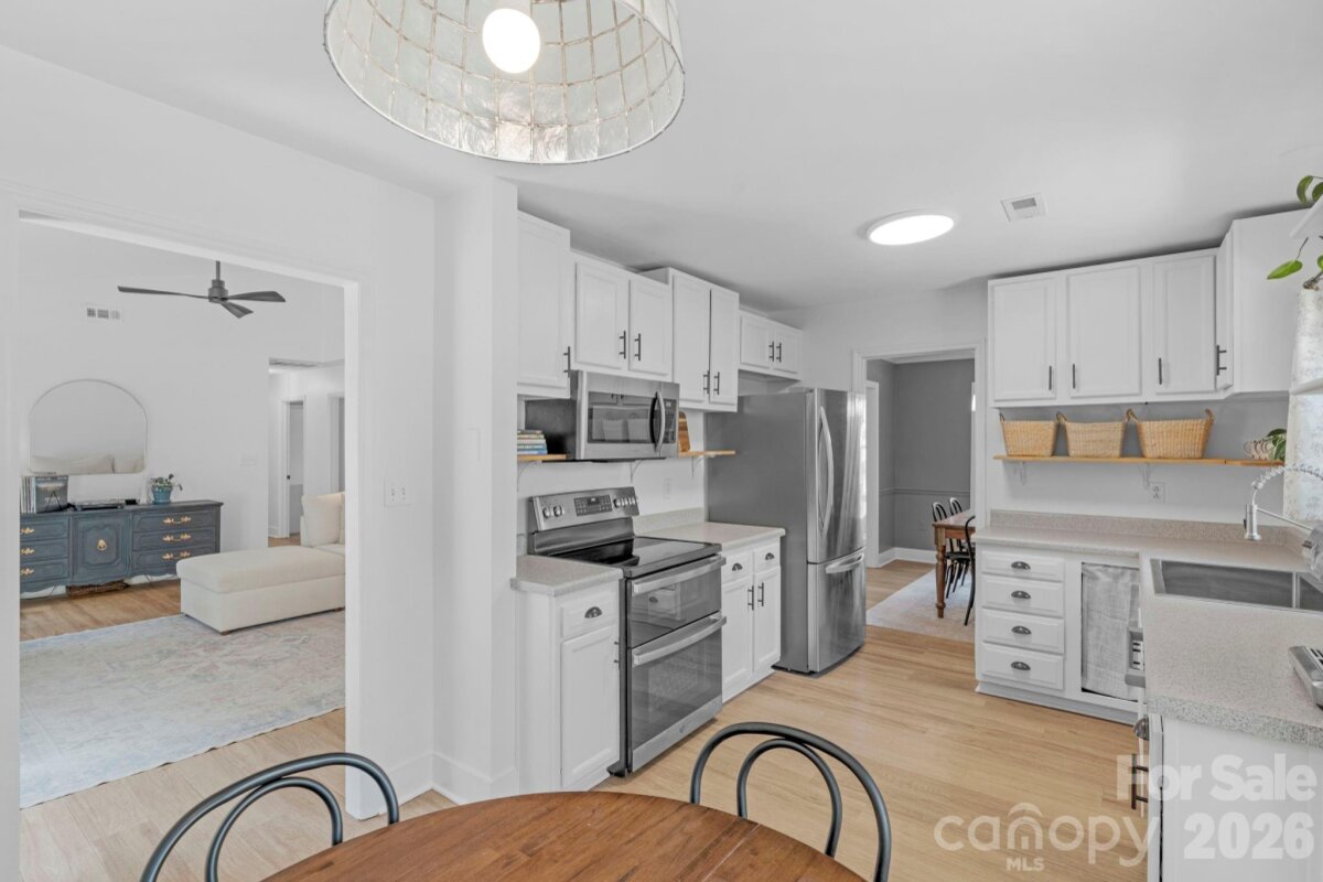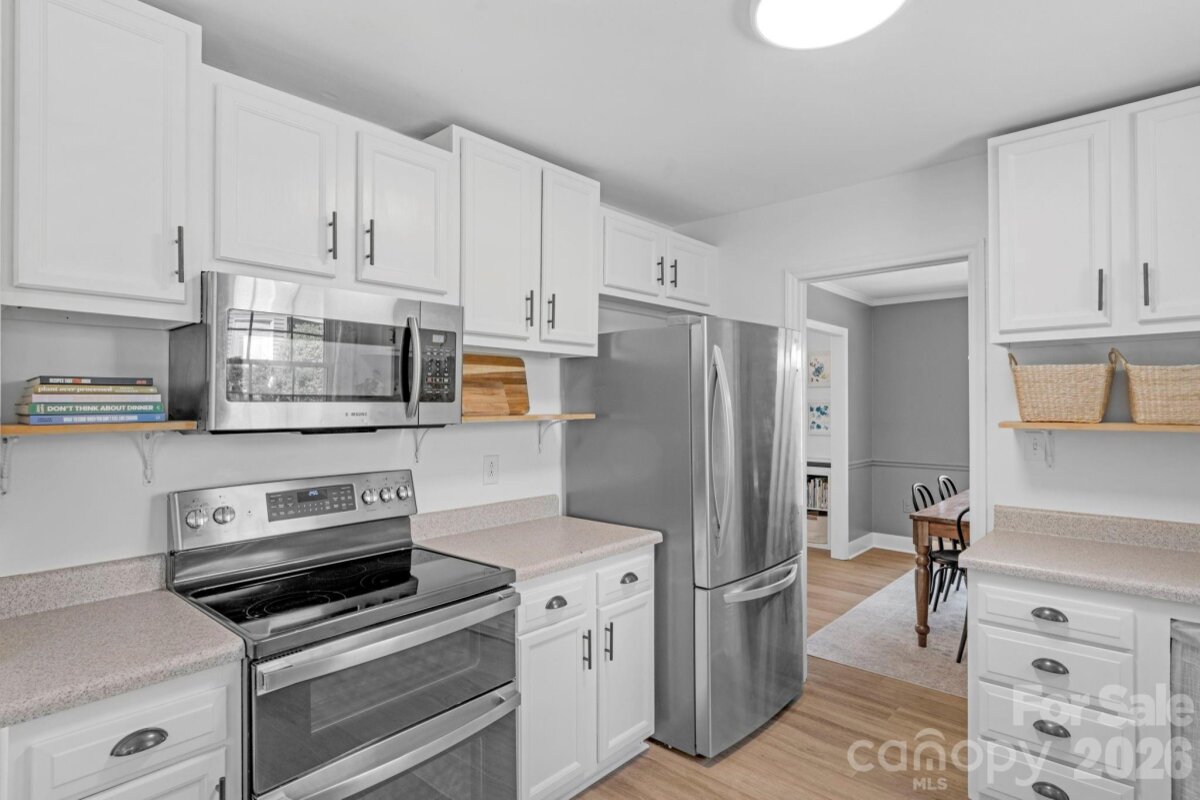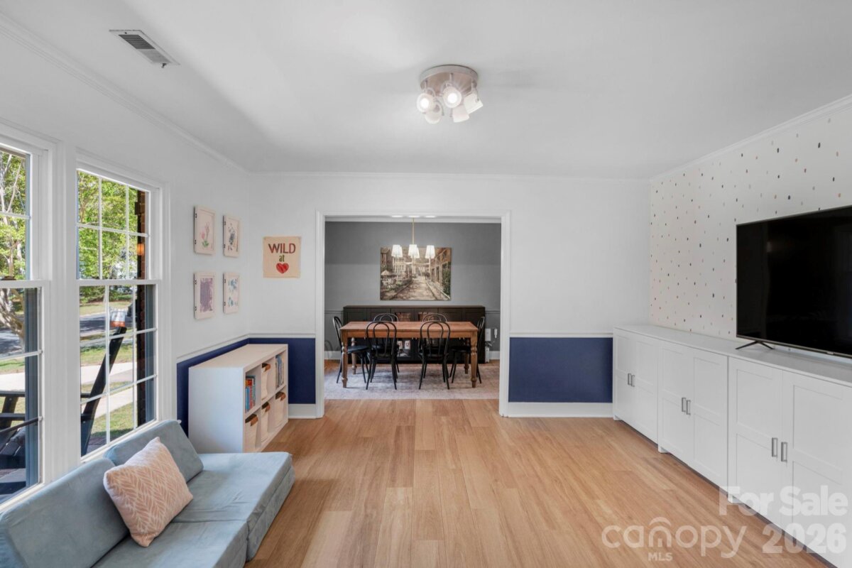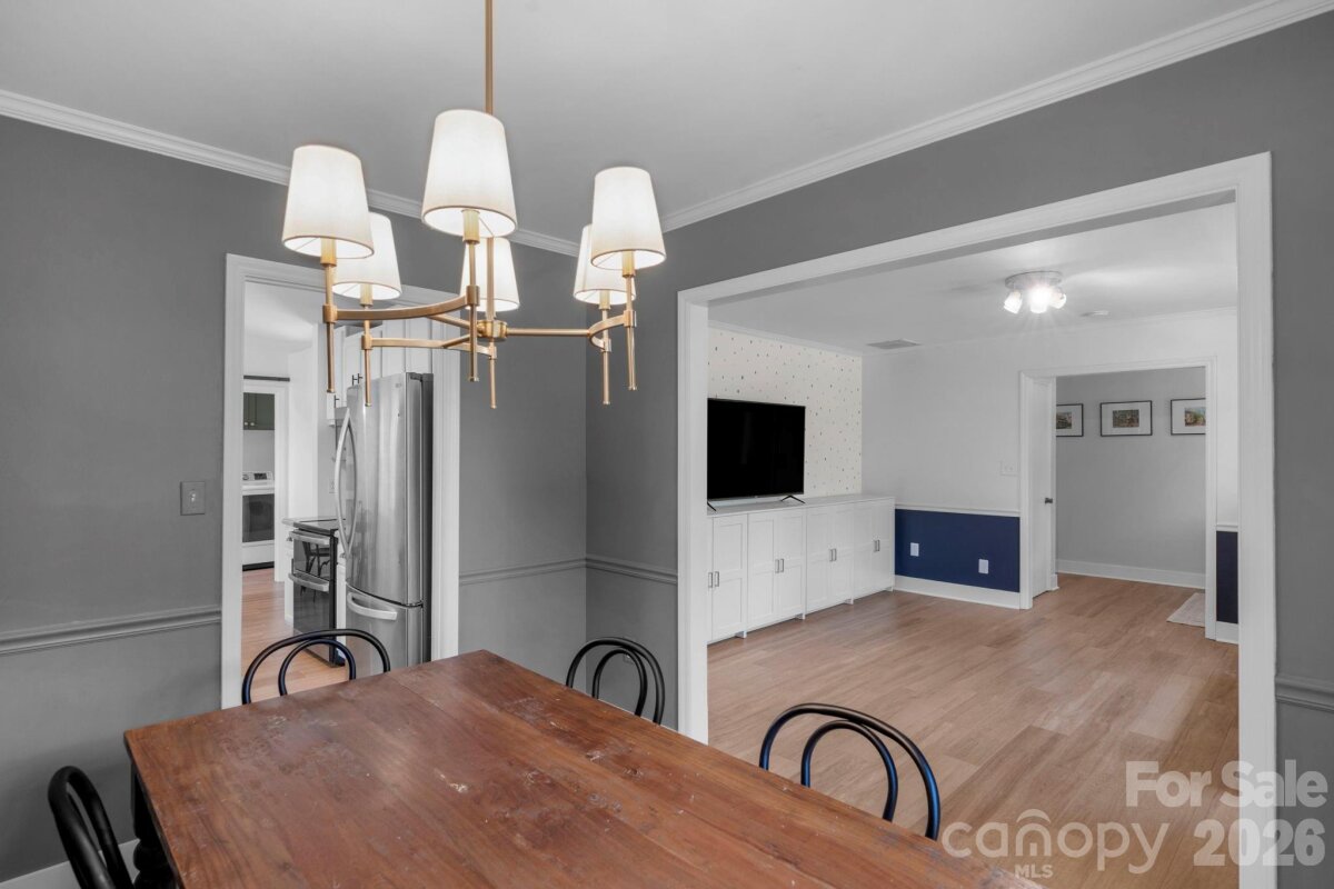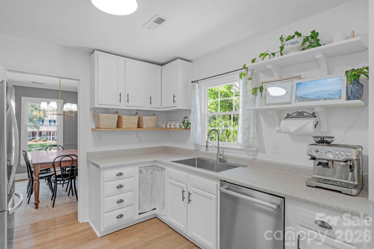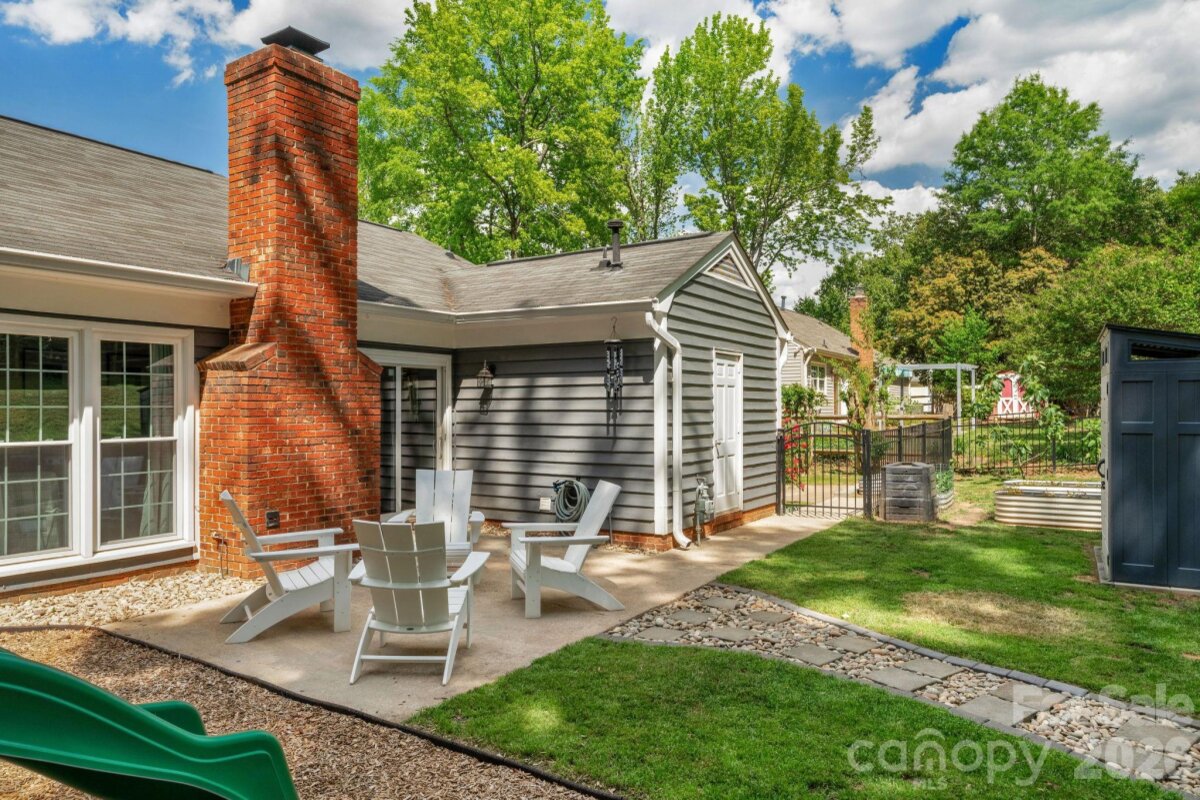Classic brick-accent ranch with inviting covered front porch and easy one-level living, set on a private, tree-lined lot in Raeburn. Inside, the layout flows naturally with updated LVP flooring from the living and dining areas into a spacious family room with vaulted ceiling and fireplace, creating a comfortable central gathering space. The kitchen features white cabinetry, stainless appliances, and a casual breakfast area, with nearby mudroom/laundry offering additional cabinets for storage and function. The primary suite is tucked on its own side of the home with an en-suite bath and walk-in closet, while two secondary bedrooms share a full bath down the hall. Both bathrooms feature update vanities, flooring and lighting. In the back yard, the home opens to a patio and fully fenced yard with play space and multiple sheds for storage, offering both privacy and flexibility for outdoor living. Residents will also enjoy fantastic neighborhood amenities such as a pool, sports courts, playgrounds, and an athletic field easily accessed on the sidewalk at the end of the cul du sac. Don't wait to call this property home!