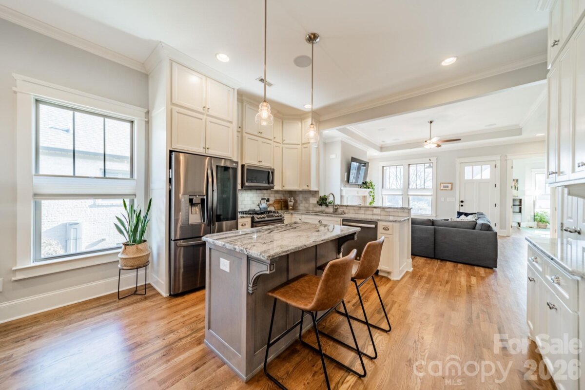 Coveted downtown city of Belmont NC location for this adorable bungalow home. Built in 2017 by an esteemed local builder, modern finishes abound in this 1-story cottage-style home. It all starts with the location, which in this case is off-the-charts amazing! Not only are you 25 seconds from the new wine and butcher shop, the Belmont city park, more restaurants, bars, coffee shops, apparel stores plus more, are literally one minute away. Let's also talk about the proximity to the Charlotte Douglas International airport that is only 15 minutes away without even getting on the highway! You have five minute access to Highway 85, then Highway 485 which circles greater Charlotte NC. While you can walk to so much from your home, getting somewhere by car when you need to is super easy! Whether working in uptown Charlotte or enjoying theater or dining, you are only about 23 minutes away - fabulous! Living in this sweet bungalow is so easy with lots of windows for natural light. The neutral paint shines in the sunlight too. Beautiful site finished wood flooring in the main living areas, plus the office and primary bedroom exude warmth. The baths feature tiled floors and tiled showers, along with designer painted vanities. Chilly days are no challenge with the cozy gas fireplace in the main living space. During warmer weather, enjoy the large screened porch and the grassed rear yard also with a paver patio space for grilling or chilling! Really cool materials were used in the screened porch ceiling and front porch planter - unique and recycled metal. The detached garage is spacious enough for your vehicles plus outdoor tools, plus built-in cabinets for even more storage. The long driveway also offers space for guests or when you want to come/go quickly for errands. Your yard will stay looking nice with underground irrigation system. Inside, the kitchen features lots of neutral painted cabinetry, designer granite counter top, stainless appliances, and an island for extra work and seating space. Open to the living space, you can take in everything around you. Enjoy relaxation and rejuvenation in your spacious primary suite with luxury adorned bath. So much to love about this home!! Living in Belmont is simply amazing, so come take a look at this small town gem of a city, Belmont NC and tour this very special offering at 112 Bryant Street!