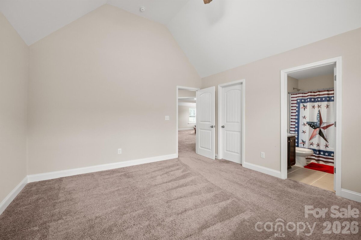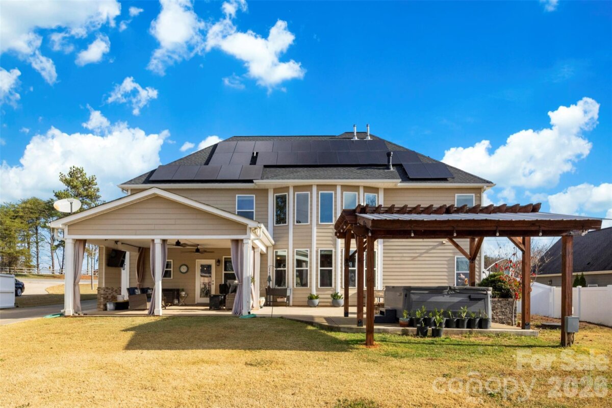 Discover the perfect blend of serene country living and effortless modern convenience in this stunning 4-bedroom, 4-bathroom residence, thoughtfully designed with an open-concept layout and generously proportioned rooms throughout. Step onto the inviting covered front porch and into a welcoming foyer that sets the tone for this expansive, light-filled home. The main level impresses with a dramatic two-story family room anchored by a cozy fireplace flanked by custom built-ins, flowing seamlessly into a chef's dream kitchen. Featuring a large center island, premium stainless steel appliances, sleek granite countertops, and a sunny breakfast area overlooking the picturesque backyard, this space is ideal for both everyday meals and effortless entertaining. Additional main-level highlights include a formal dining room with elegant coffered ceiling, a dedicated home office, a versatile bedroom or bonus room, a full bathroom, and a convenient laundry room. Ascend to the upper level to find a luxurious primary suite retreat, complete with a spa-inspired ensuite bath offering a luxury walk-in shower, and ample natural light. Three additional spacious bedrooms and two full baths provide comfort and privacy for family or guests. Step outside to your private backyard oasis—a true entertainer's paradise. Relax in the soothing spa beneath a covered pergola with built-in bench seating, gather around the cozy fire pit, or host unforgettable evenings on the expansive 24x24 covered porch (pre-wired for your outdoor TV). Set on a generous 2.15-acre lot, the property offers abundant space for parking boats, jet skis, RVs, campers, or trailers within the secure, gated driveway enclosure. Water enthusiasts will love being just 1 mile from the nearest public boat dock on the peninsula perfect for lake adventures and outdoor recreation. Energy-efficient solar panels (paid off at closing) deliver lower utility bills and a reduced environmental footprint, allowing you to enjoy sustainable luxury without compromise. Nestled in peaceful, nature-surrounded tranquility yet conveniently close to Main Street shopping, dining, and quick access to Highways 85 and 485, this exceptional home masterfully combines refined comfort, thoughtful amenities, and prime location. Your countryside escape awaits—schedule your private showing today!