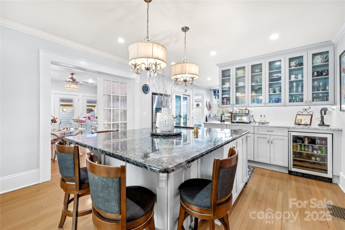 Timeless character meets modern comfort in this beautifully restored early-1900s home, ideally located in Gastonia’s historic district with zoning that allows for commercial office space. Owned by a contractor and thoughtfully renovated from top to bottom, this cozy yet exceptionally well-built property offers the charm of an older home with none of the typical older-home issues—and truly too many upgrades to mention. Inside, you’ll find real original hardwood floors throughout and an oversized primary bedroom featuring three closets, offering rare space and storage for a historic home. The custom-built kitchen is a showstopper with granite and quartz countertops, stainless steel appliances, pot filler, primary and prep sinks, and a convenient appliance lift/mixer stand. All kitchen appliances convey. Additional upgrades include a whole-house water filtration system, reverse-osmosis drinking water faucets, and an on-demand tankless water heater. Major systems were fully updated in 2016, including HVAC, electrical, and plumbing (all permitted by the City of Gastonia), along with injected foam insulation in all exterior walls. The home also features new exterior doors, Low-E glass windows, and a roof replaced in 2012, providing energy efficiency and peace of mind. Outdoor living shines with a 500-sq-ft cobblestone patio, brick built-in grill with natural gas, attached water spigot, inground drip irrigation, and low-maintenance, drought-resistant landscaping—no grass to mow. A detached oversized double garage (24’ x 28’, built in 2020) is fully insulated with ceiling fans, epoxy floors and ample storage. Storage is abundant with a large floored attic with closet rods, basement storage, and additional garage space. Located in a quiet, walkable neighborhood with lots of walkers and dog walkers, this move-in-ready home is within walking distance to Gastonia’s favorite foodie spots, Caromont Ballpark, and just two blocks from the Greenway. A rare opportunity to own a meticulously upgraded historic home in one of Gastonia’s most desirable areas.