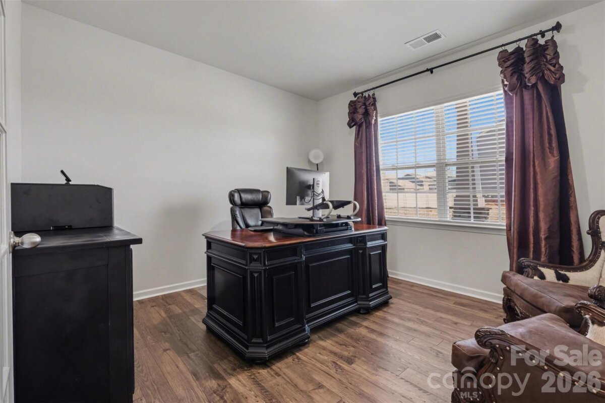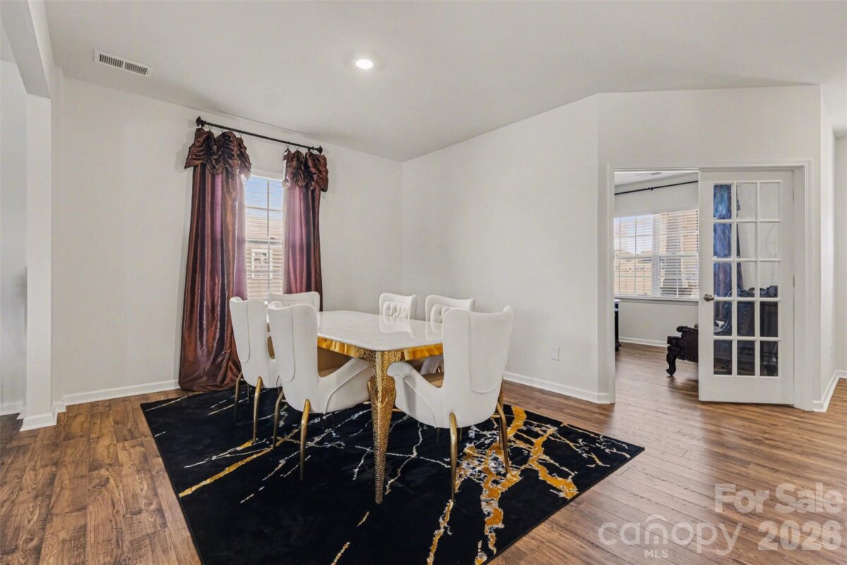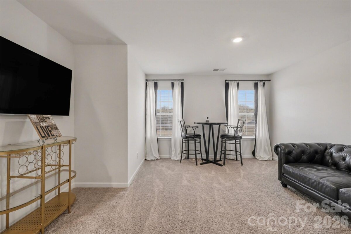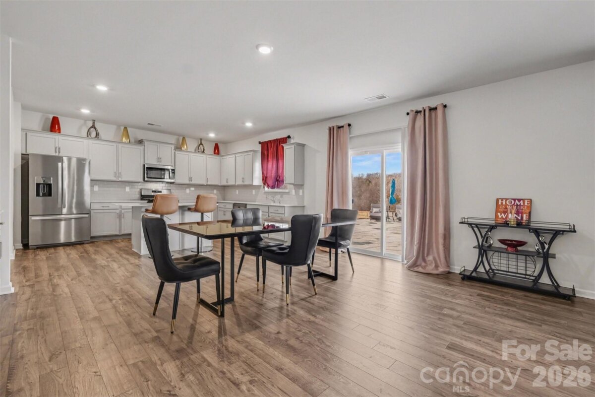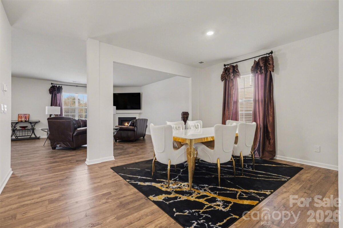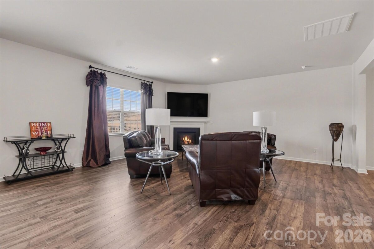 Welcome to this beautifully maintained, nearly new two-story home in the highly desirable Nolen Farm community. Built in 2023, this spacious residence offers 4 bedrooms, 3.5 baths, and over 3,200 square feet designed for modern living with an open, airy flow and stylish finishes throughout. Step inside to find luxury vinyl plank flooring across the main level and a bright open floorplan that seamlessly connects the main living spaces. The kitchen is the heart of the home, featuring a large island, sleek cabinetry, stainless steel appliances including a gas range, and a walk-in pantry for exceptional storage. The kitchen flows effortlessly into the dining area and inviting living room, where a gas log fireplace creates a warm and welcoming focal point. Upstairs, the expansive primary suite offers a true retreat with generous proportions, a walk-in closet, and a well-appointed bath. Three additional bedrooms are thoughtfully sized, and a spacious bonus room provides flexible space ideal for a media room, playroom, or secondary living area. The laundry room is conveniently located on the upper level for everyday ease. Situated on a premium lot within the community, this home enjoys added privacy and space. There are no homes or structures directly behind the property—only the walking path—along with greater distance between neighboring homes compared to standard lots, creating a more open and comfortable setting. Outdoor living is elevated with a stamped concrete patio, offering distinctive detail and character well beyond a standard concrete pad—perfect for relaxing or entertaining. The level yard enhances usability and outdoor enjoyment. This home is also equipped with a smart home and security system, including three exterior cameras, providing both convenience and peace of mind. A two-car attached garage and concrete driveway complete the package. Residents of Nolen Farm enjoy access to outstanding amenities including a clubhouse, outdoor pool, playground, dog park, tennis courts, game court, walking trails, and sidewalks throughout the neighborhood, supporting an active and connected lifestyle.