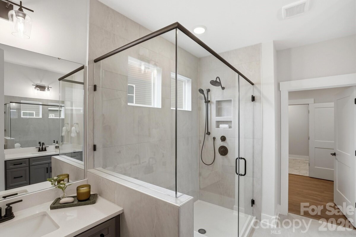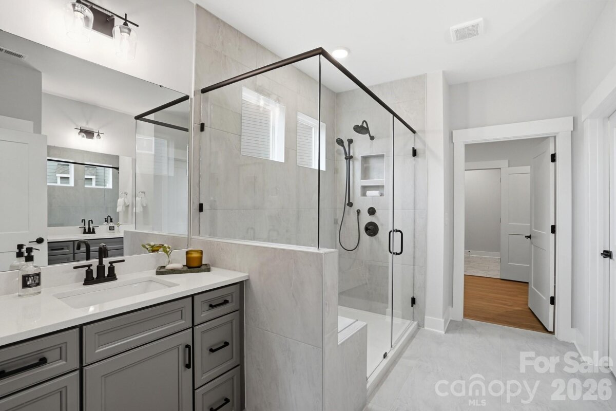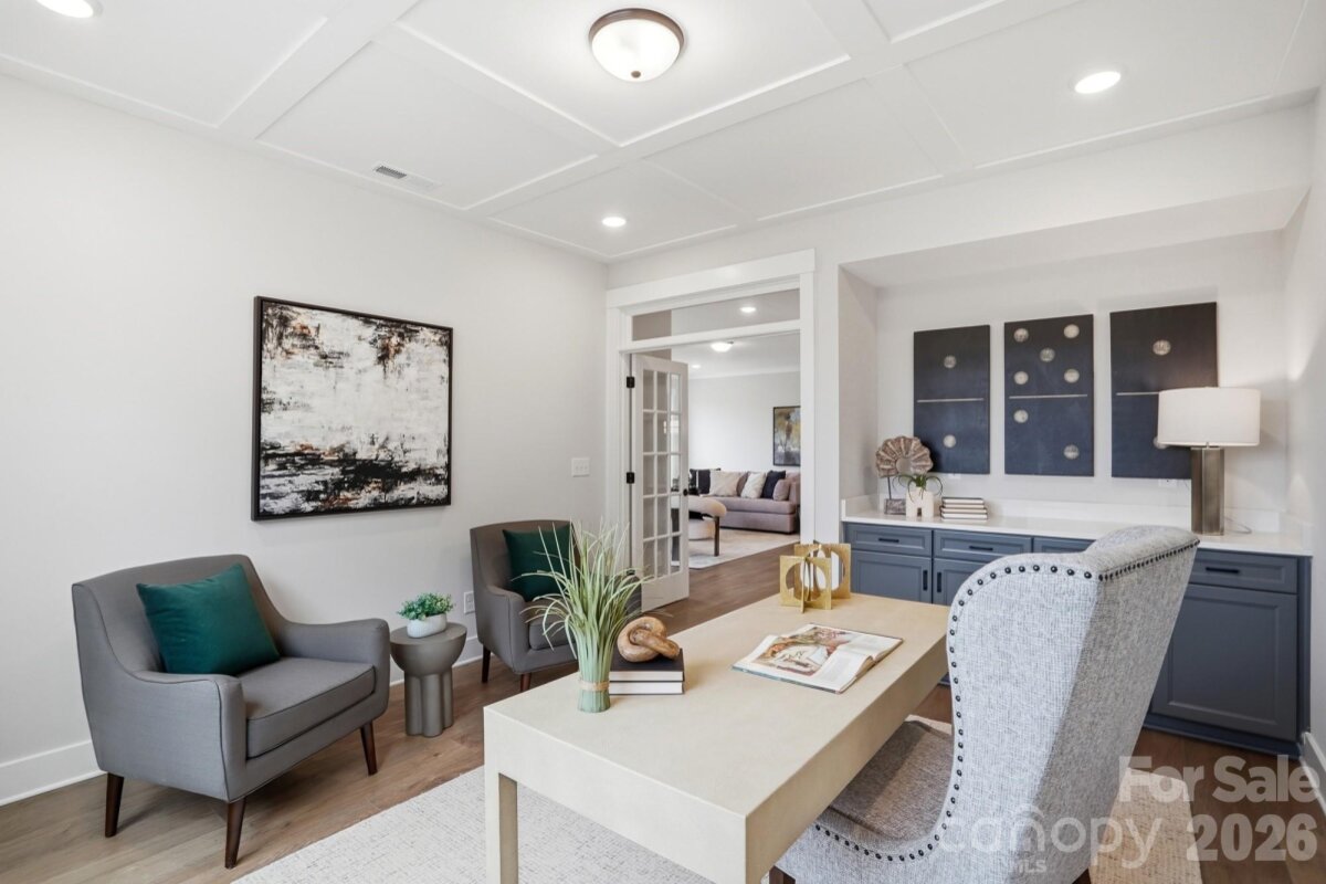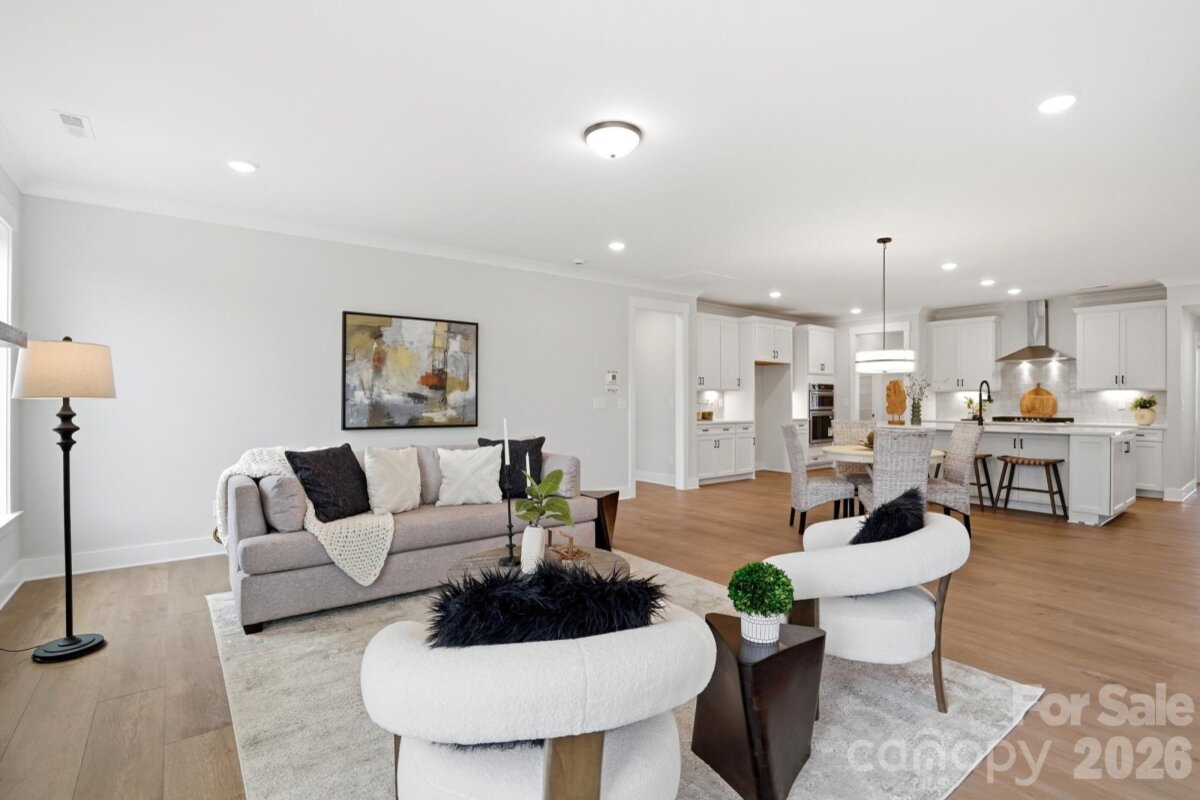 Discover the Edgefield ranch-style home offering 3 bedrooms, 2.5 baths, a rear screened porch, and more than 2,600 square feet of main-level living. Enter the home through the foyer with tray ceiling & Craftsman-style wood trim and see the beautiful dining room with matching trim. The designer kitchen features a farmhouse sink, large island with storage, white cabinets, quartz counters, tile backsplash, and stainless appliances. A butler pantry matches the kitchen decor and connects to the dining room. The family room is accented with a Cosmo, direct-vent gas fireplace surrounded by a shiplap wall. This home also has an office with built-in cabinets and French doors. The primary suite boasts a tray ceiling, a luxury shower with bench seat & semi-frameless door, and two separate vanities. A beadboard drop zone at garage entry and laundry room with cabinets add convenience and storage. Additional bedrooms can access a full bath with a tiled tub/shower combo and double-bowl vanity. Neighborhood amenities include a cabana with outdoor pool, perfect for relaxing and entertaining.