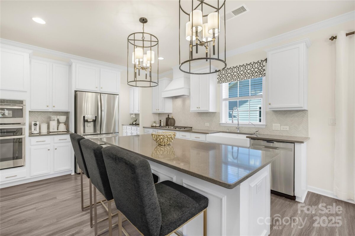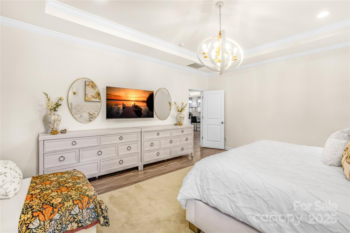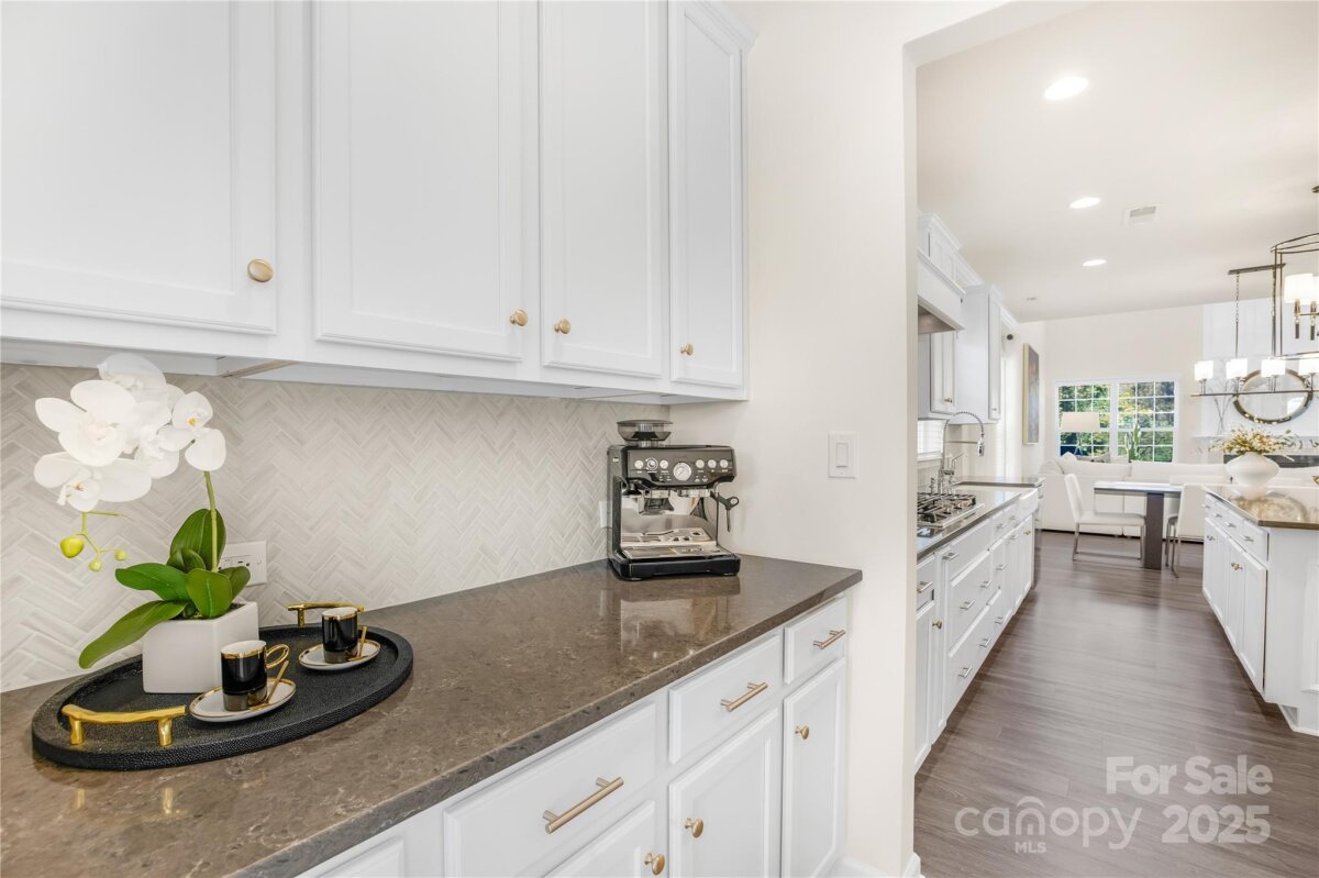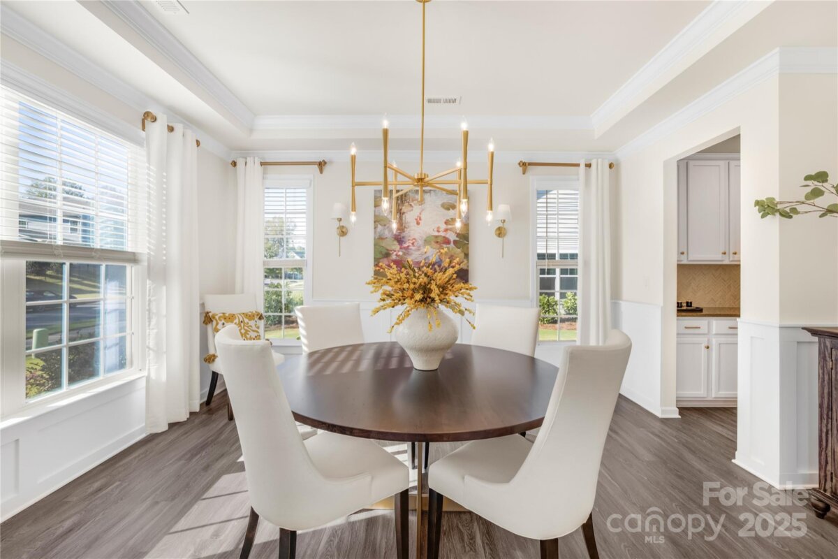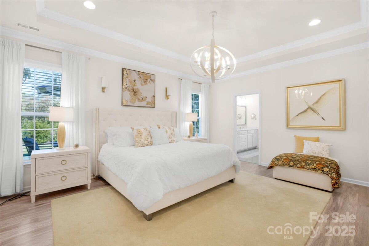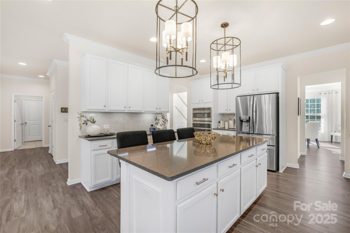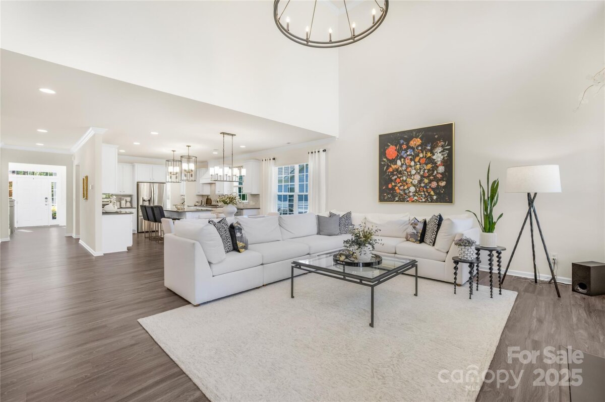 Welcome to this exceptionally maintained upscale designer home in the highly sought-after Farrington community! Perfectly situated on a premium lot directly across from the community tree save area and backing to a private, tree-lined view with plenty of room for your future pool, you just can't find a better location than this! With over 3,600 sf., this Torrance II plan blends luxury, comfort, and refined design throughout. The first level makes an unforgettable impression with a grand two-story foyer that opens to an elegant and thoughtfully designed living space. The breathtaking two-story great room boasts a soaring 20-foot ceiling and a gas fireplace that serves as a stunning focal point, framed by eye-catching custom millwork that stretches to the ceiling and enhances the room’s dramatic scale. The inviting great room flows seamlessly into the heart of the home, the gourmet kitchen, complete with a second dining/breakfast area, a large statement island, double wall ovens, gas cooktop, porcelain farmhouse sink, quartz countertops, custom walk-in pantry, a butler's pantry, coffee station and a built-in water filtration system ideal for both entertaining and everyday living. A huge formal dining room provides the perfect setting for hosting memorable gatherings, while the recently installed custom shutters throughout the main level adds timeless elegance. The main-level owner’s suite is a true retreat, offering a spa-like ensuite with an extended luxury walk-in shower, venetian marble dual vanity, polished porcelain tile flooring, and upscale finishes throughout. The second level continues to impress with three generously sized bedrooms, designer lighting, and wood stairs with open railings overlooking the foyer. A spacious loft/flex room featuring a “summer kitchen†offers endless possibilities, perfect as a game room, media space, man cave, or even a 5th bedroom with its oversized walk-in closet. Two full baths ensure comfort and convenience for family and guests alike. Step outside to a fully fenced backyard and an incredible screened-in porch enhanced by custom landscaping and a built-in exterior gas line for grilling, creating an ideal space to relax or entertain while enjoying the peaceful wooded views with even plenty of room for your summer pool. With undeniable curb appeal and ideally located just minutes from shopping at Birkdale Village, close to parks, greenways, athletic fields, schools, and is within an easy drive of Uptown Charlotte and Charlotte Douglas International Airport this home delivers elevated style, sophistication & location all in one stunning package. You don't want to miss seeing this home in person!