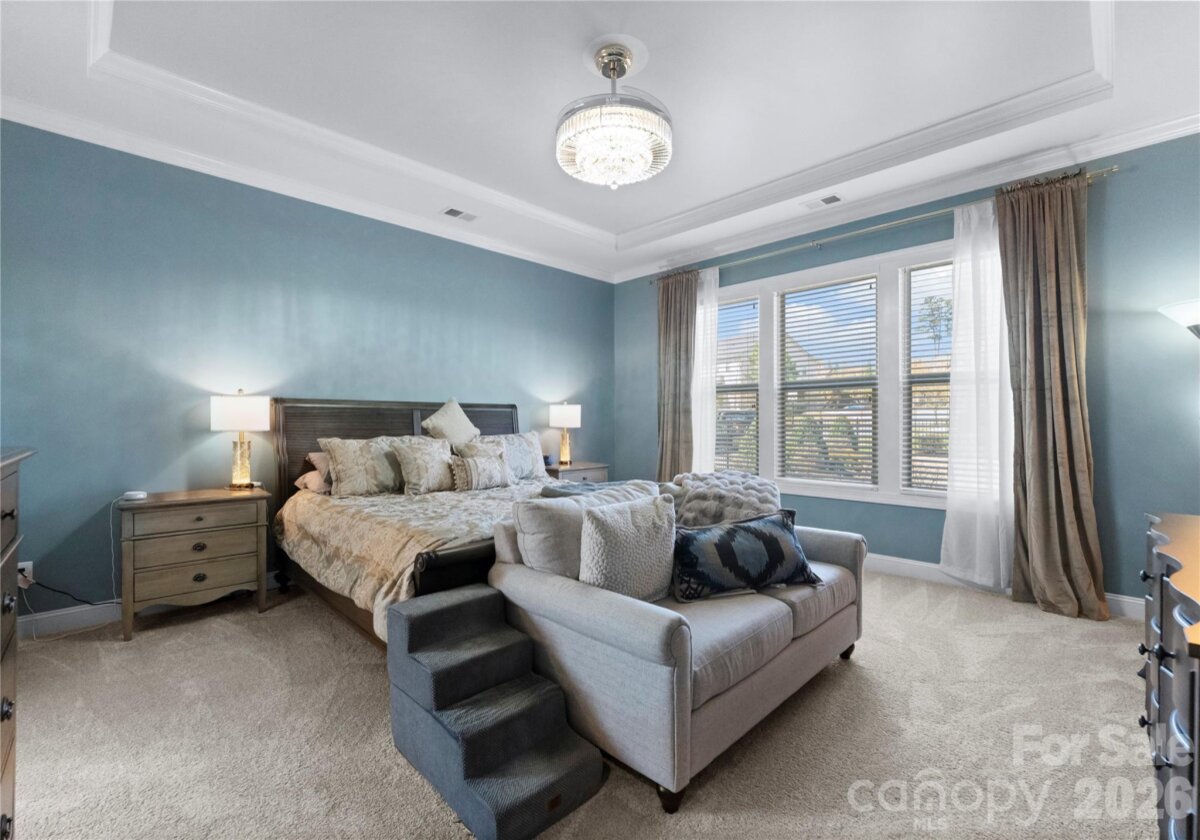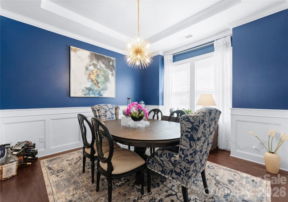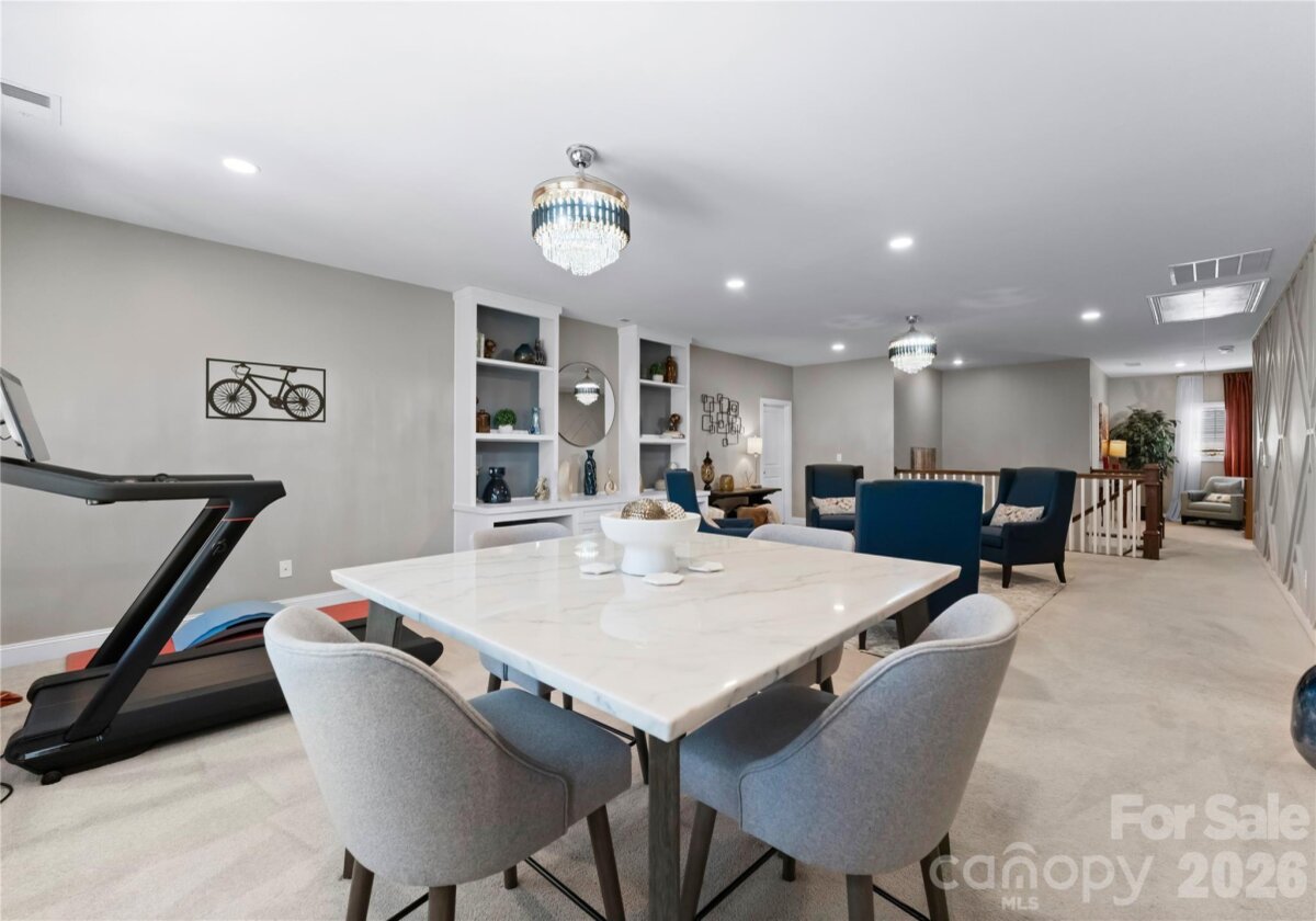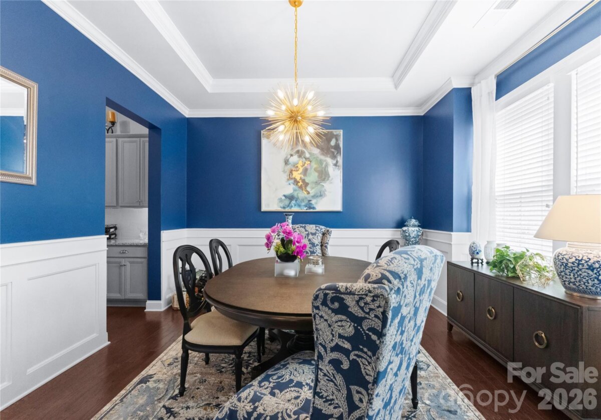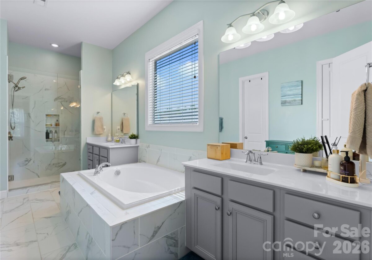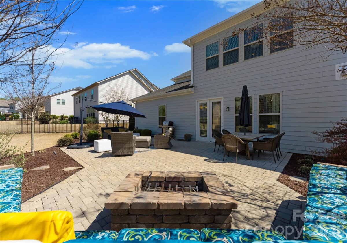 Welcome to this exceptional 6-bedroom, 4-bath residence in the highly sought-after Mirabella community in Huntersville, where elegant design and spacious living come together beautifully. Perfectly positioned on a corner lot with a side-load 3-car garage, the exterior showcases an arched accent roofline with a striking blend of brick, stone veneer, and James Hardie siding, delivering outstanding curb appeal. Inside, more than 4,600 square feet of thoughtfully designed living space unfolds with soaring 10-foot ceilings, hardwood floors throughout the main living areas, and a desirable split floor plan featuring both the Primary Suite and a Guest Suite on the main level. The chef’s kitchen is the heart of the home, highlighted by a massive full-slab island with designer globe pendants, and flows seamlessly into the Great Room and dining area—perfect for everyday living and entertaining. A butler’s pantry provides additional prep space and connects to the elegant formal dining room with tray ceiling, wainscoting, and designer lighting. The luxurious Primary Suite offers a peaceful retreat with a huge custom walk-in closet and spa-inspired bath featuring Carrara-look porcelain tile, frameless glass shower with bench and niche, garden tub, and dual separate vanities. Additional main-level spaces include a private office at the front entry and a convenient drop zone/mudroom at the garage entry. Upstairs, flexibility and entertainment take center stage with an immense bonus room and dedicated media room, along with spacious secondary bedrooms and dual vanities in both upstairs bathrooms. Step outside to a beautifully designed backyard featuring an expansive paver patio with built-in bench and fire pit, surrounded by upgraded landscaping and ambient landscape lighting in both the front and rear yards—an ideal setting for relaxing evenings or hosting memorable gatherings. Additional highlights include new HVAC (Feb 2026), fenced rear yard, designer lighting throughout, ample storage, and built-in tool and storage cabinets in the garage. This remarkable home combines generous square footage, elegant architectural details, and an exceptional location within Mirabella—offering the perfect balance of luxury, comfort, and lifestyle.