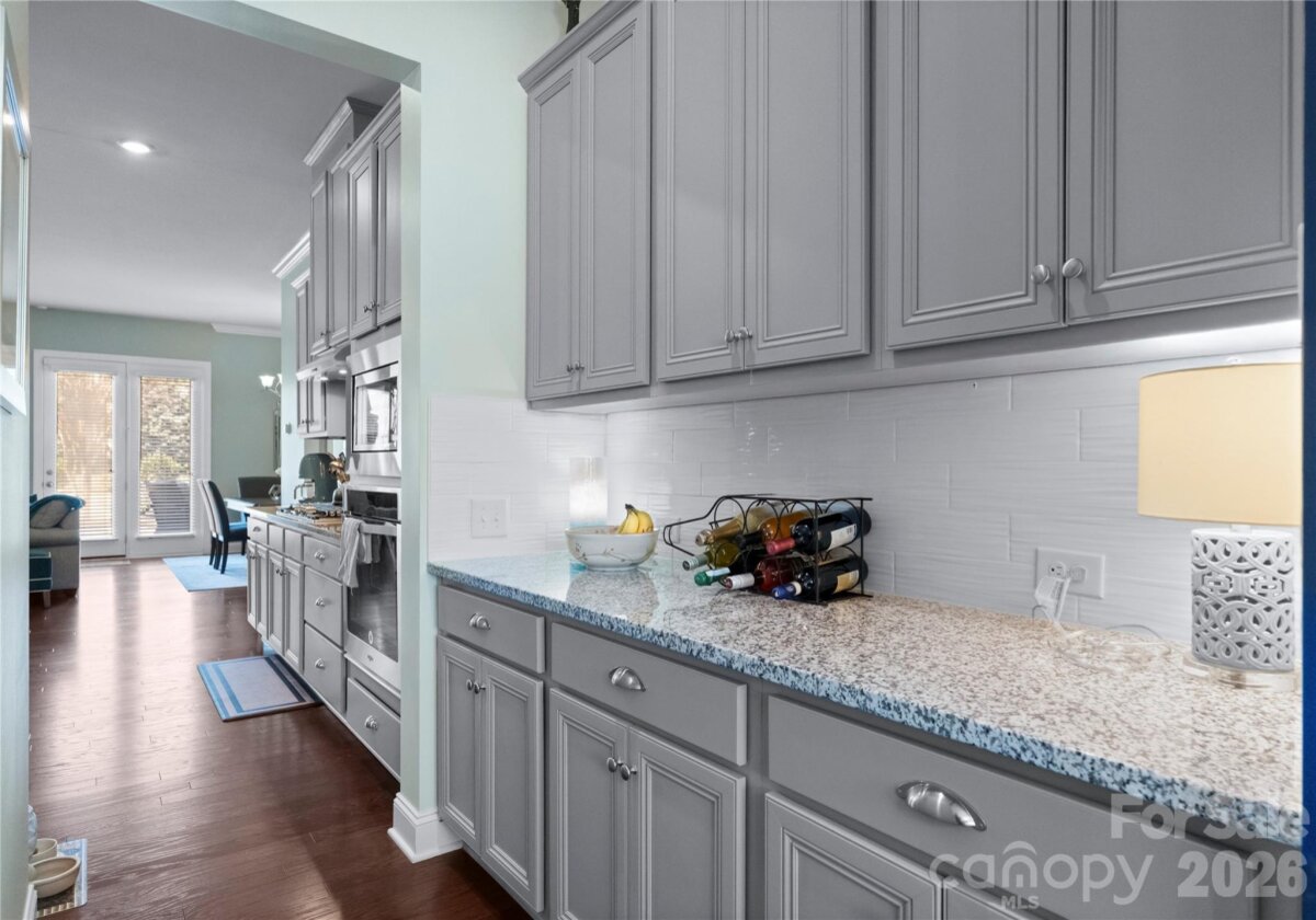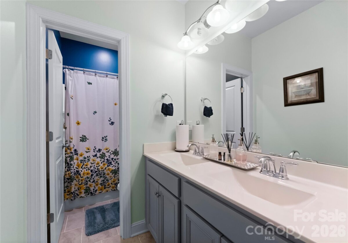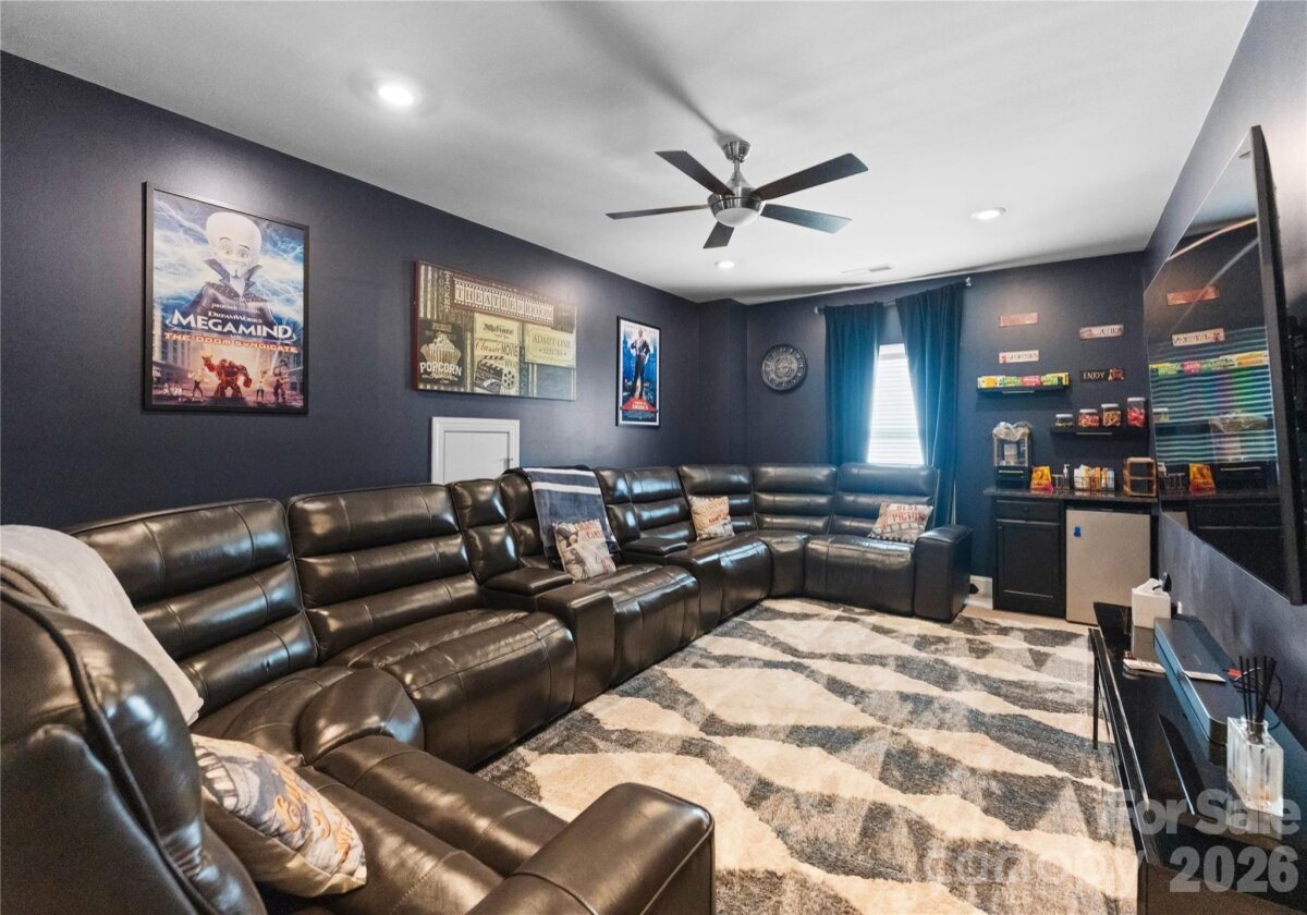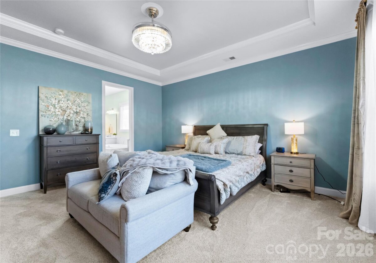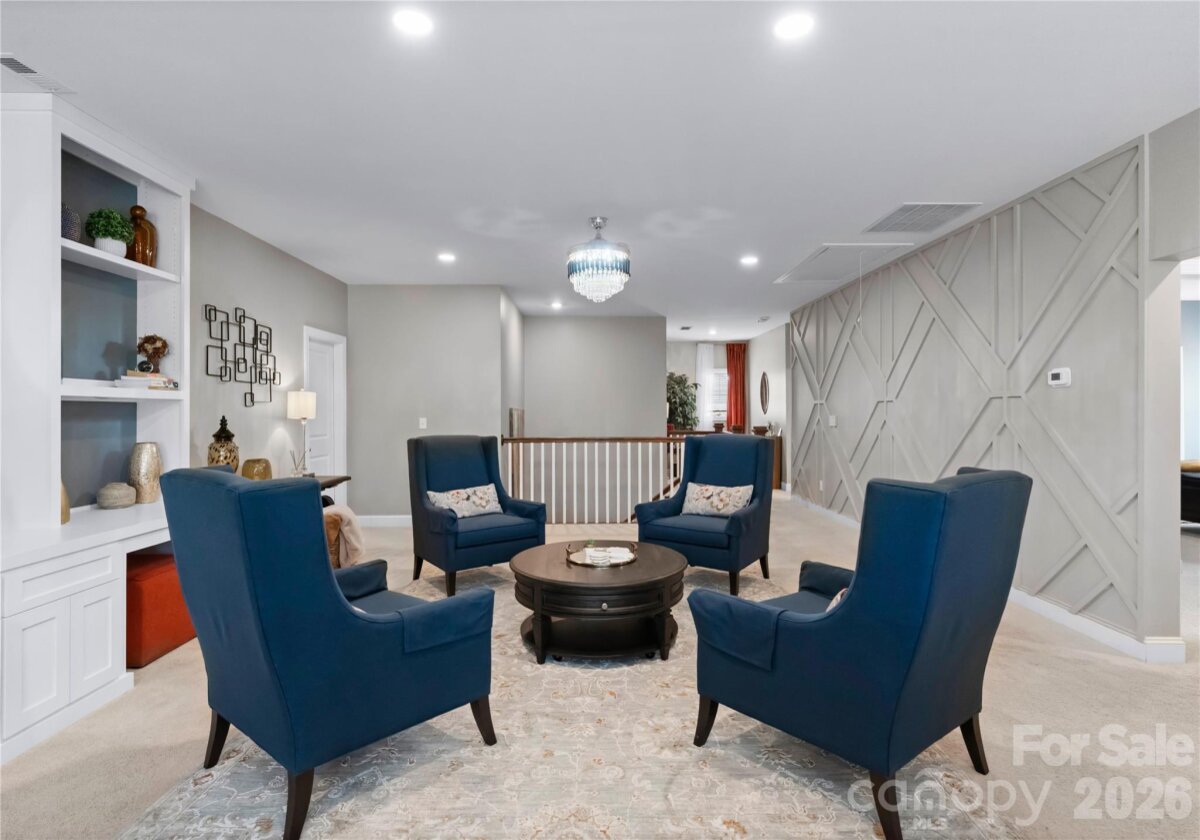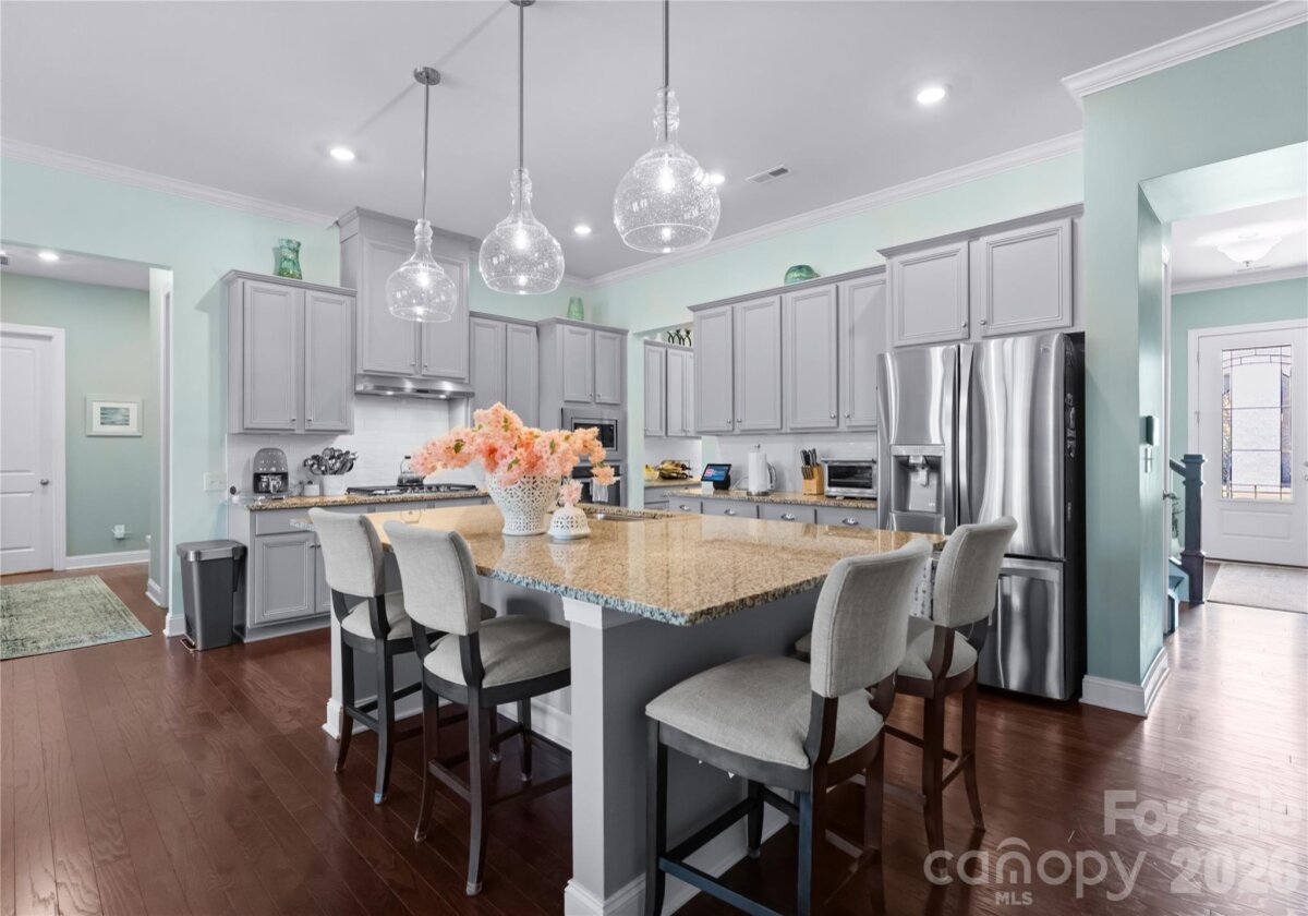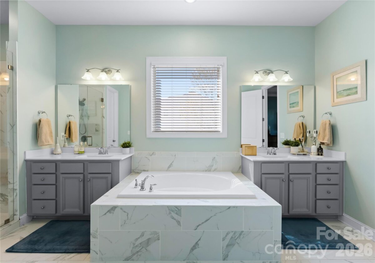 Welcome to this exceptional 6-bedroom, 4-bath residence in the highly sought-after Mirabella community in Huntersville, where elegant design and spacious living come together beautifully. Perfectly positioned on a corner lot with a side-load 3-car garage, the exterior showcases an arched accent roofline with a striking blend of brick, stone veneer, and James Hardie siding, delivering outstanding curb appeal. Inside, more than 4,600 square feet of thoughtfully designed living space unfolds with soaring 10-foot ceilings, hardwood floors throughout the main living areas, and a desirable split floor plan featuring both the Primary Suite and a Guest Suite on the main level. The chef’s kitchen is the heart of the home, highlighted by a massive full-slab island with designer globe pendants, and flows seamlessly into the Great Room and dining area—perfect for everyday living and entertaining. A butler’s pantry provides additional prep space and connects to the elegant formal dining room with tray ceiling, wainscoting, and designer lighting. The luxurious Primary Suite offers a peaceful retreat with a huge custom walk-in closet and spa-inspired bath featuring Carrara-look porcelain tile, frameless glass shower with bench and niche, garden tub, and dual separate vanities. Additional main-level spaces include a private office at the front entry and a convenient drop zone/mudroom at the garage entry. Upstairs, flexibility and entertainment take center stage with an immense bonus room and dedicated media room, along with spacious secondary bedrooms and dual vanities in both upstairs bathrooms. Step outside to a beautifully designed backyard featuring an expansive paver patio with built-in bench and fire pit, surrounded by upgraded landscaping and ambient landscape lighting in both the front and rear yards—an ideal setting for relaxing evenings or hosting memorable gatherings. Additional highlights include new HVAC (Feb 2026), fenced rear yard, designer lighting throughout, ample storage, and built-in tool and storage cabinets in the garage. This remarkable home combines generous square footage, elegant architectural details, and an exceptional location within Mirabella—offering the perfect balance of luxury, comfort, and lifestyle.