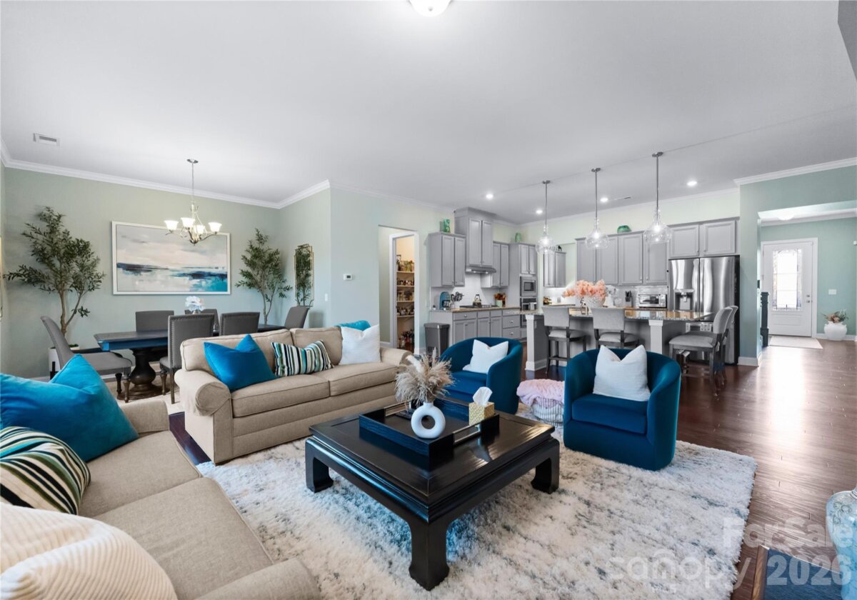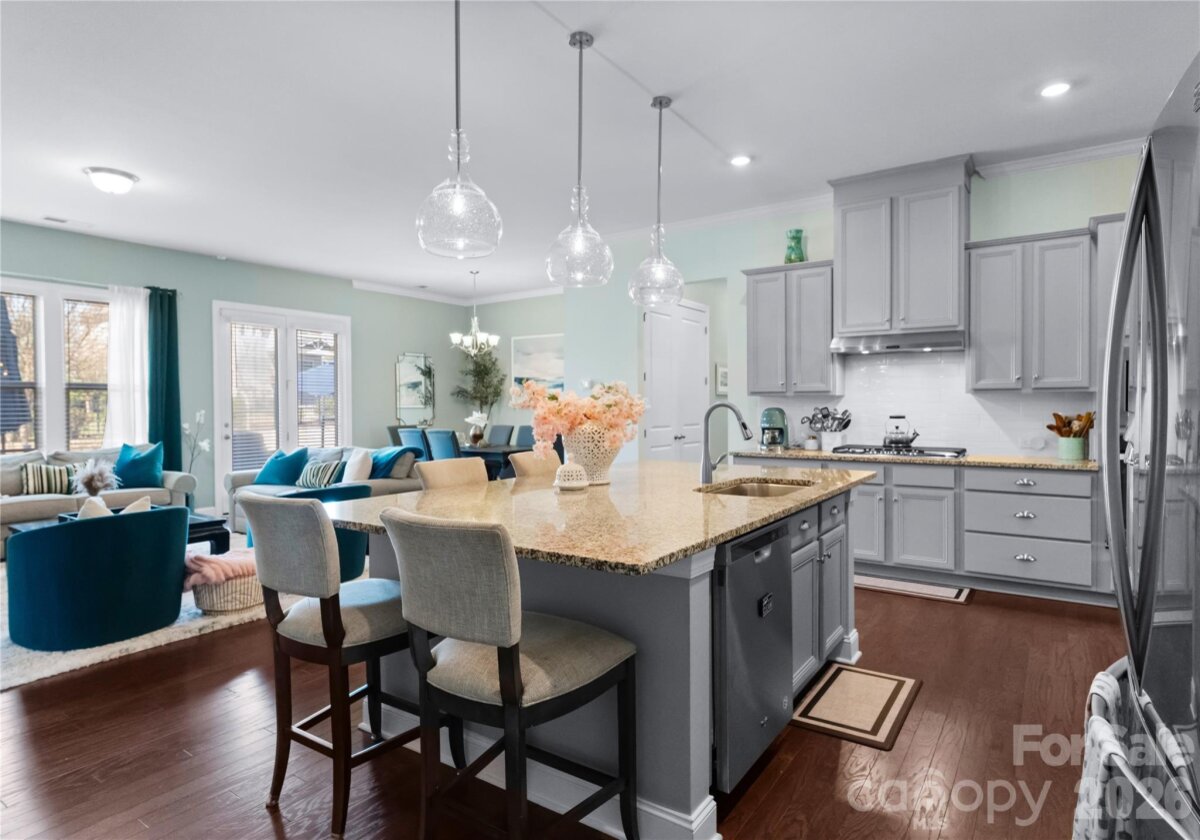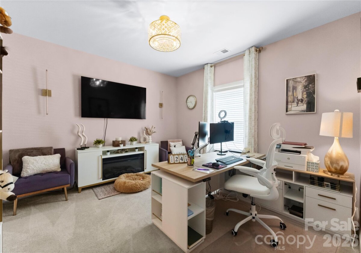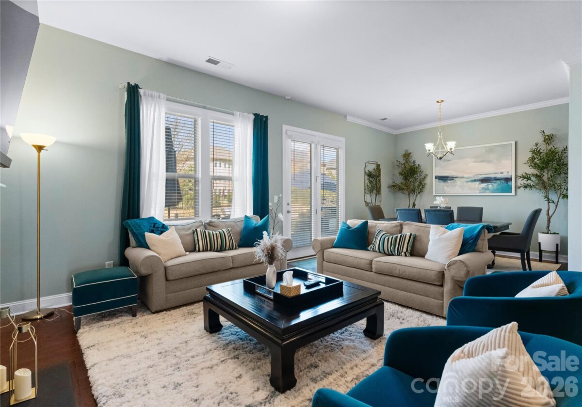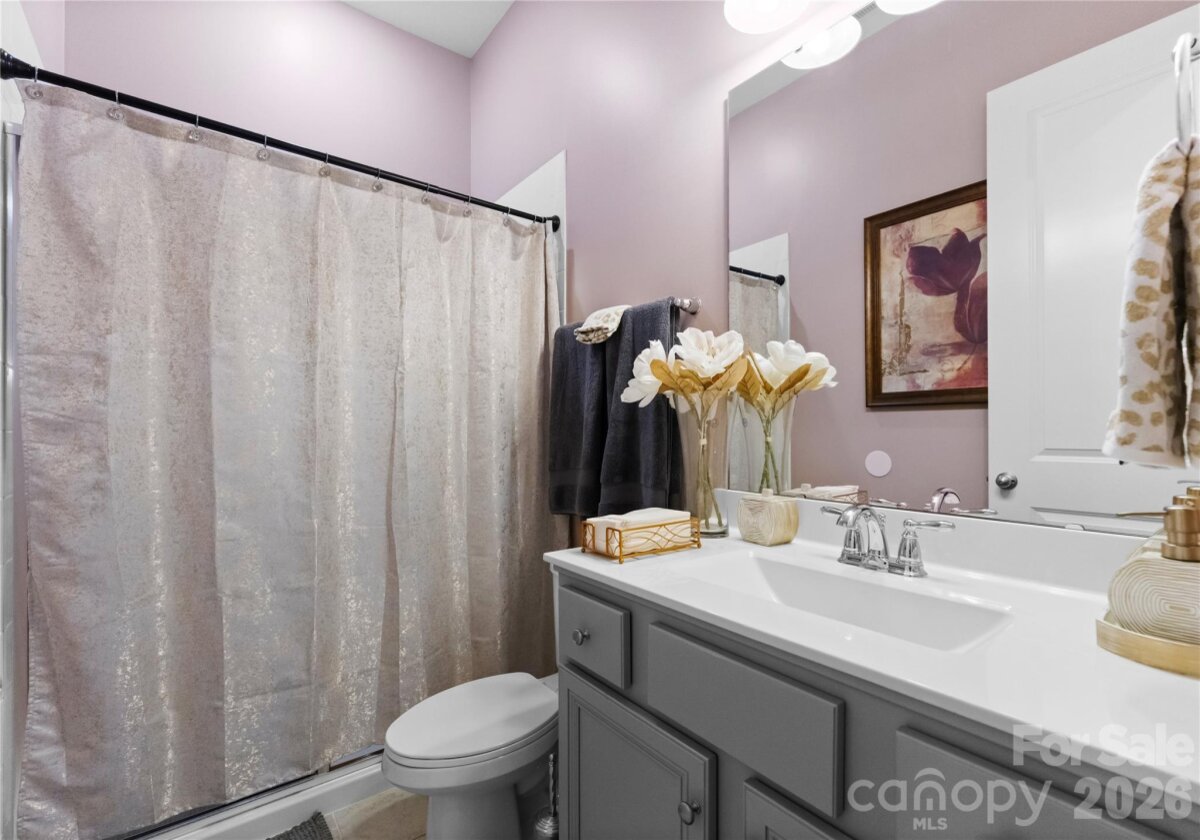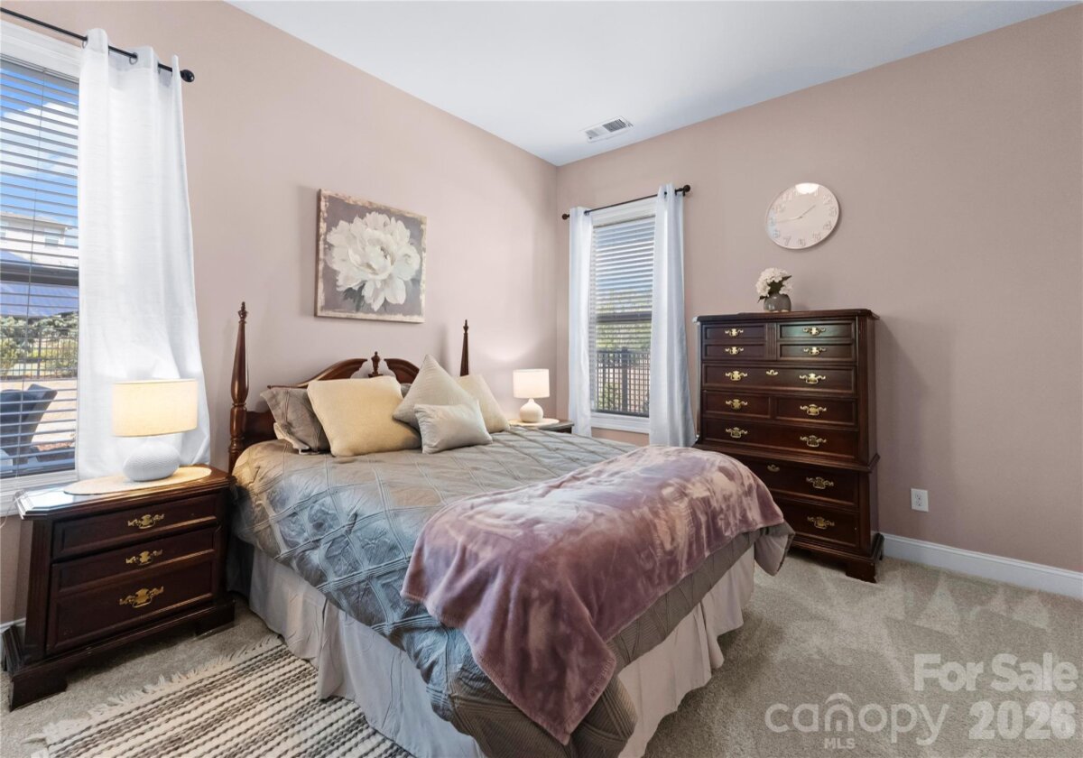 Welcome to this exceptional 6-bedroom, 4-bath residence in the highly sought-after Mirabella community in Huntersville, where elegant design and spacious living come together beautifully. Perfectly positioned on a corner lot with a side-load 3-car garage, the exterior showcases an arched accent roofline with a striking blend of brick, stone veneer, and James Hardie siding, delivering outstanding curb appeal. Inside, more than 4,600 square feet of thoughtfully designed living space unfolds with soaring 10-foot ceilings, hardwood floors throughout the main living areas, and a desirable split floor plan featuring both the Primary Suite and a Guest Suite on the main level. The chef’s kitchen is the heart of the home, highlighted by a massive full-slab island with designer globe pendants, and flows seamlessly into the Great Room and dining area—perfect for everyday living and entertaining. A butler’s pantry provides additional prep space and connects to the elegant formal dining room with tray ceiling, wainscoting, and designer lighting. The luxurious Primary Suite offers a peaceful retreat with a huge custom walk-in closet and spa-inspired bath featuring Carrara-look porcelain tile, frameless glass shower with bench and niche, garden tub, and dual separate vanities. Additional main-level spaces include a private office at the front entry and a convenient drop zone/mudroom at the garage entry. Upstairs, flexibility and entertainment take center stage with an immense bonus room and dedicated media room, along with spacious secondary bedrooms and dual vanities in both upstairs bathrooms. Step outside to a beautifully designed backyard featuring an expansive paver patio with built-in bench and fire pit, surrounded by upgraded landscaping and ambient landscape lighting in both the front and rear yards—an ideal setting for relaxing evenings or hosting memorable gatherings. Additional highlights include new HVAC (Feb 2026), fenced rear yard, designer lighting throughout, ample storage, and built-in tool and storage cabinets in the garage. This remarkable home combines generous square footage, elegant architectural details, and an exceptional location within Mirabella—offering the perfect balance of luxury, comfort, and lifestyle.