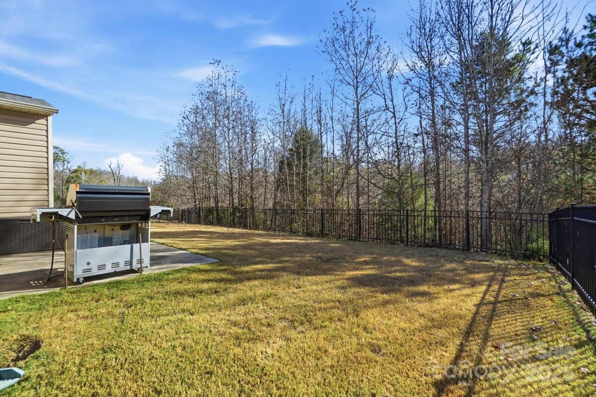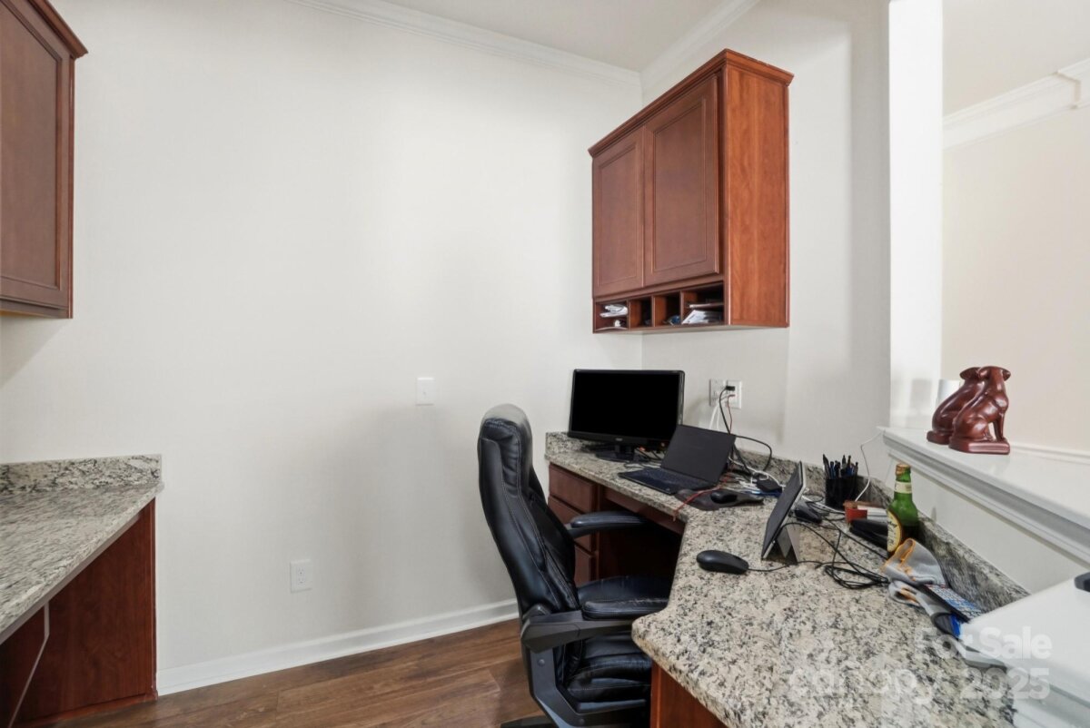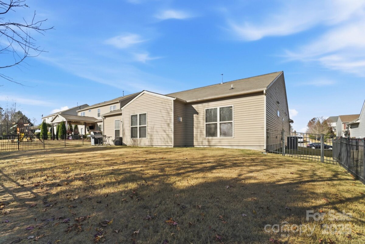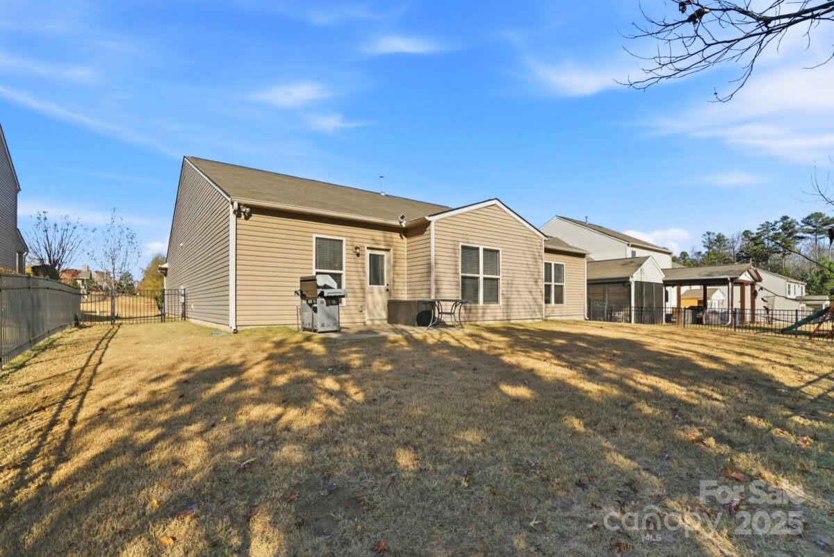 Welcome to this beautifully maintained ranch-style home offering a spacious open layout in highly desirable Indian Land. The inviting floor plan features a large great room with exposed ceiling beams, abundant natural light, and a cozy gas fireplace—perfect for both entertaining and everyday living. The chef’s kitchen boasts granite countertops, stainless steel appliances, gas range, tile backsplash, an oversized island with seating, and ample cabinetry, all flowing seamlessly into the dining area. A flexible front room offers the ideal space for a formal dining room, game room, office, or second living area. The private primary suite includes a generous bedroom, huge walk-in closet, and a spa-like bath with dual vanities, granite counters, and an upgraded tiled shower with bench seating. Two additional bedrooms are spacious and bright with easy access to a full bath, along with a conveniently located half bath for guests. A dedicated built-in office nook provides the perfect work-from-home setup. Enjoy the practical mudroom with built-in drop zone and a separate laundry room. Outside, a level backyard and concrete patio offer the perfect space for grilling, relaxing, or hosting friends. With single-level living, upgraded finishes throughout, and convenient proximity to top-rated schools, shopping, and restaurants, this home truly offers the best of comfort and convenience.