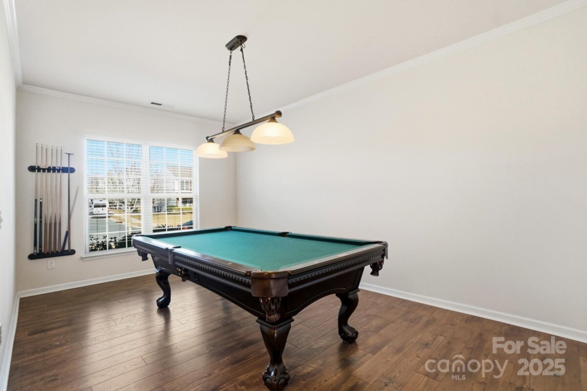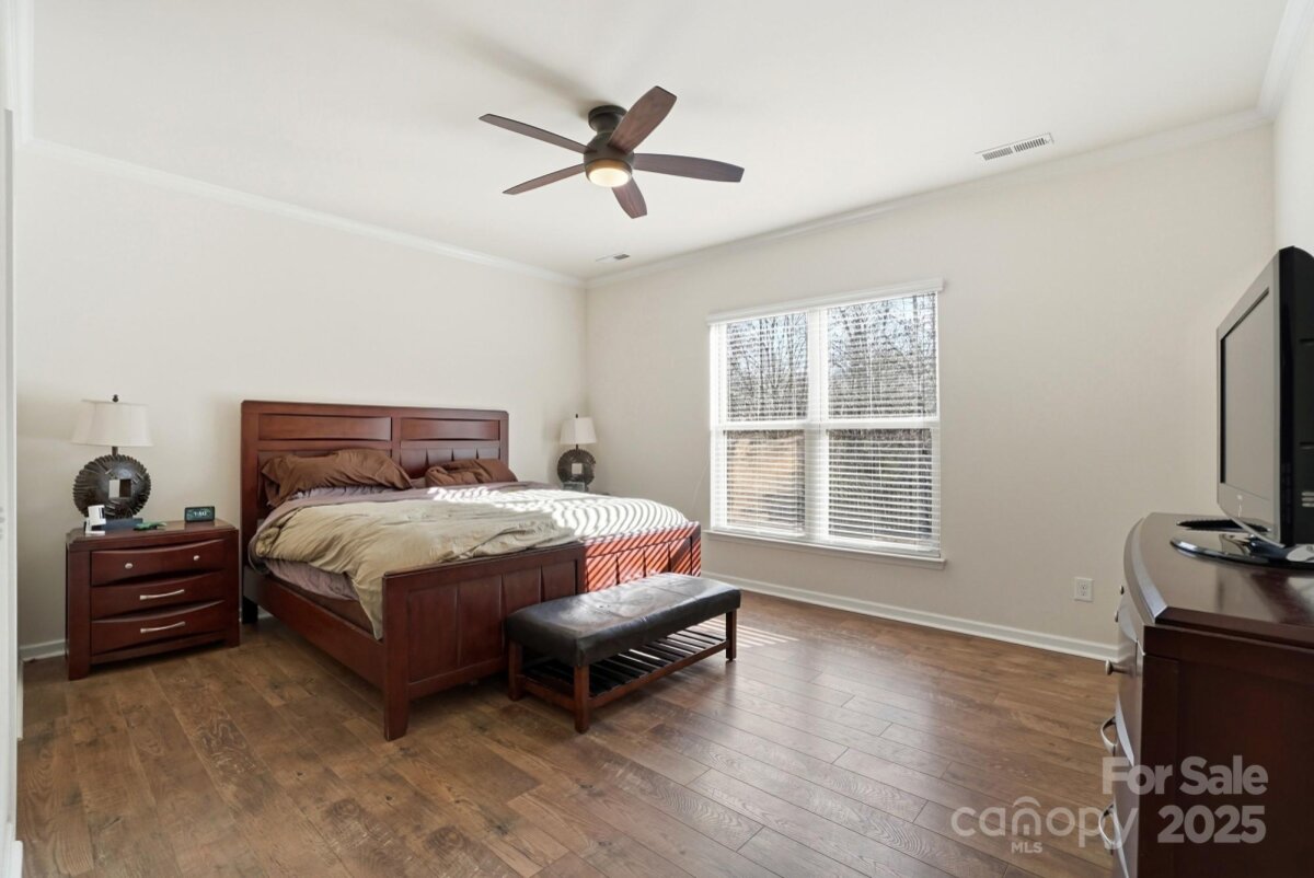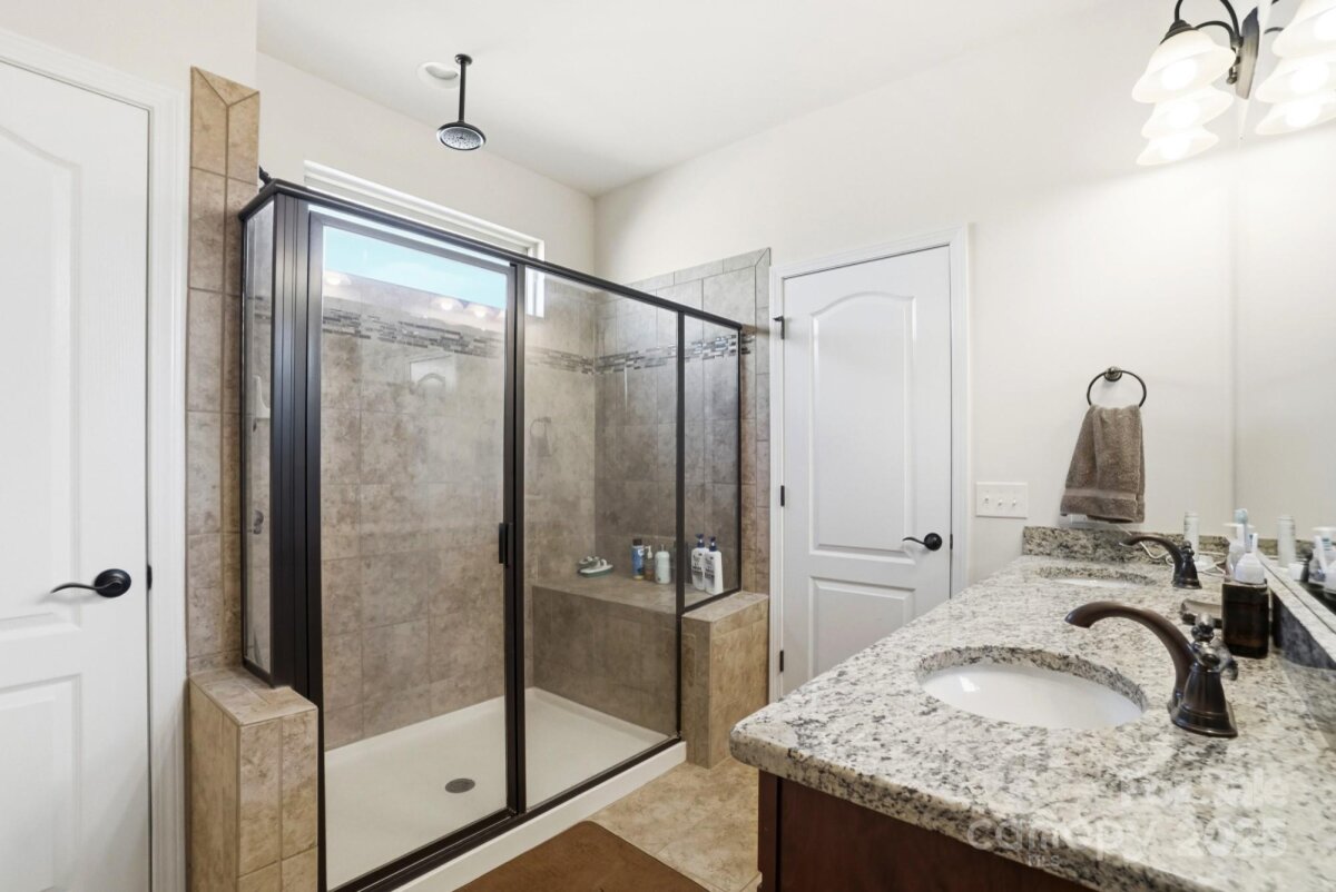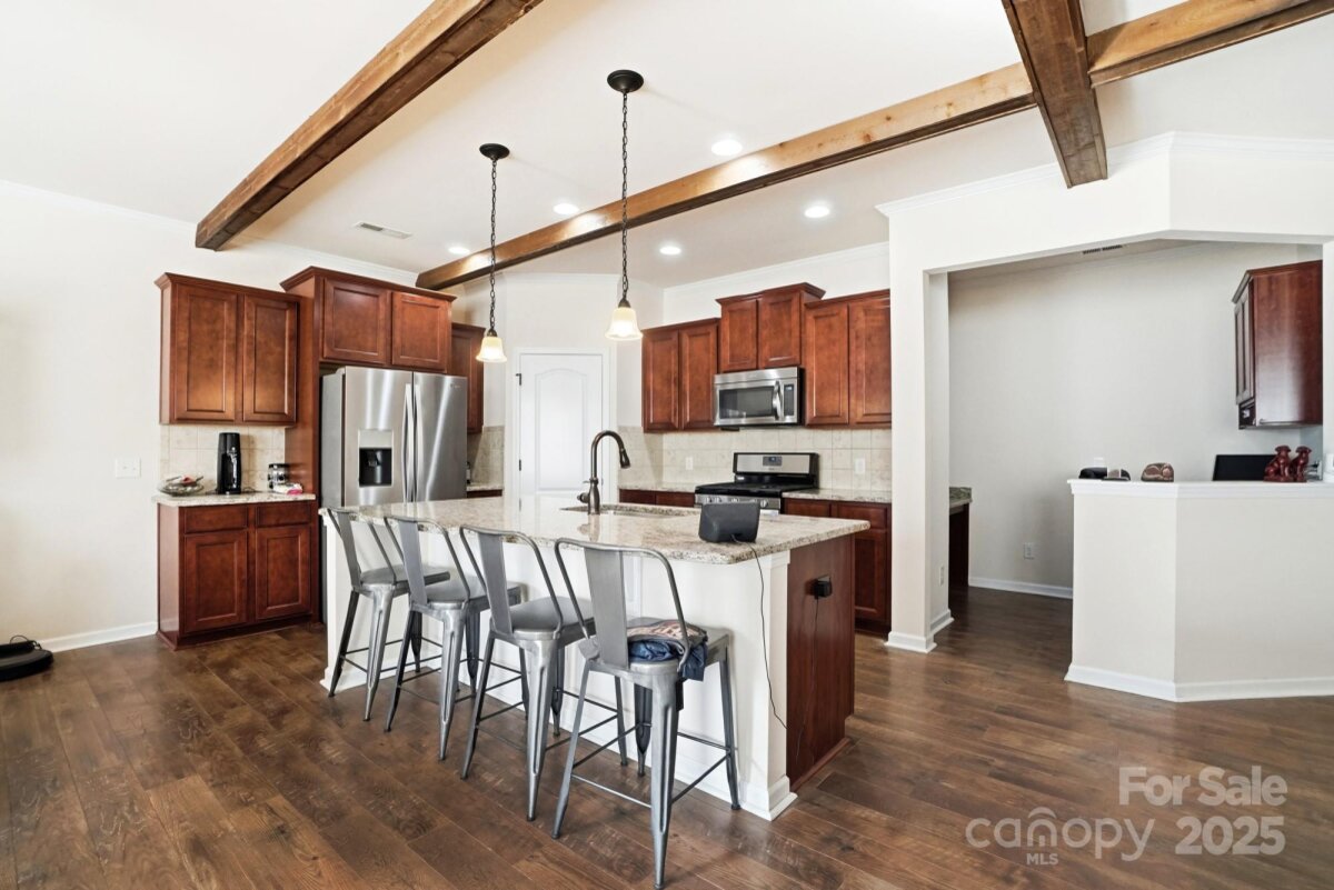Welcome to this beautifully maintained ranch-style home offering a spacious open layout in highly desirable Indian Land. The inviting floor plan features a large great room with exposed ceiling beams, abundant natural light, and a cozy gas fireplace—perfect for both entertaining and everyday living. The chef’s kitchen boasts granite countertops, stainless steel appliances, gas range, tile backsplash, an oversized island with seating, and ample cabinetry, all flowing seamlessly into the dining area. A flexible front room offers the ideal space for a formal dining room, game room, office, or second living area. The private primary suite includes a generous bedroom, huge walk-in closet, and a spa-like bath with dual vanities, granite counters, and an upgraded tiled shower with bench seating. Two additional bedrooms are spacious and bright with easy access to a full bath, along with a conveniently located half bath for guests. A dedicated built-in office nook provides the perfect work-from-home setup. Enjoy the practical mudroom with built-in drop zone and a separate laundry room. Outside, a level backyard and concrete patio offer the perfect space for grilling, relaxing, or hosting friends. With single-level living, upgraded finishes throughout, and convenient proximity to top-rated schools, shopping, and restaurants, this home truly offers the best of comfort and convenience.