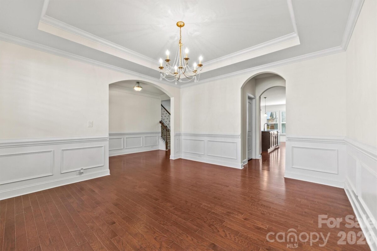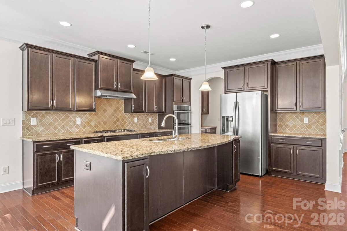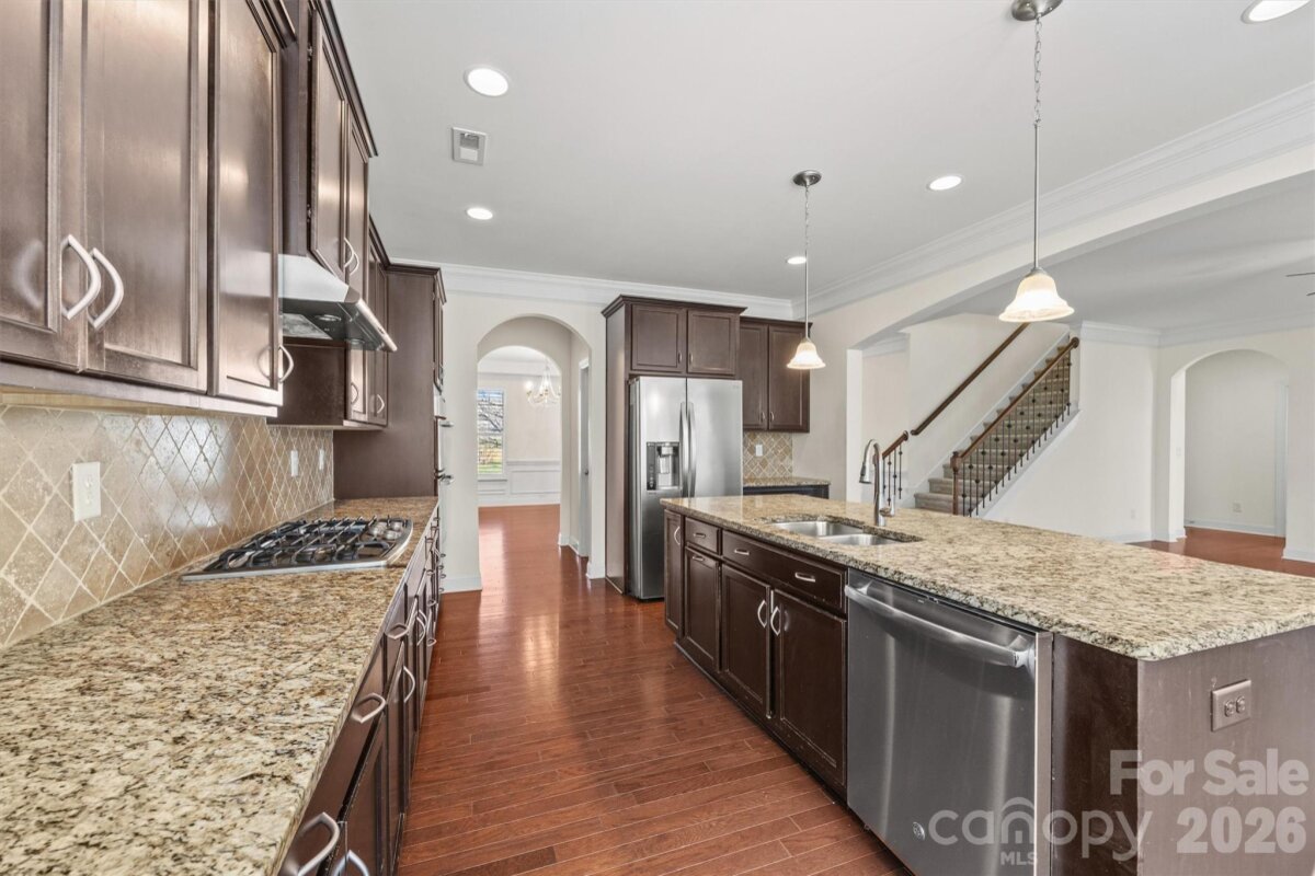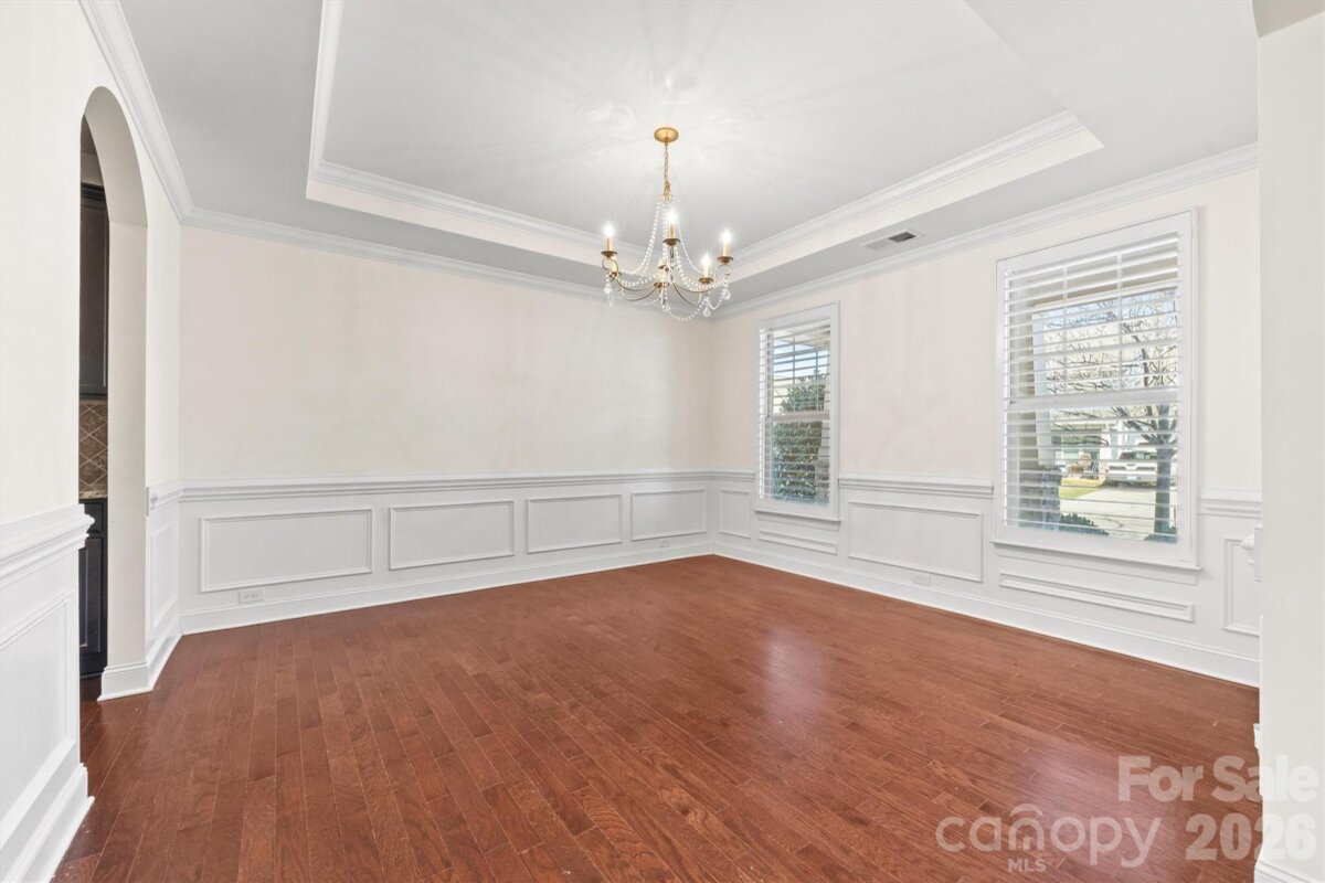 Beautiful, Move in Ready 5 Bedroom 3 Bath home located in The Enclaves at Crismark! This Craftsman-style residence welcomes you wit charming curb appeal and a spacious front porch. Inside, the home features a hardwood floored foyer, formal dining room, butler's bar, pantry, leading into an open-concept living room/kitchen perfect for everyday living and entertainment. The Kitchen is well appointed with dark wood cabinetry, granite countertops, stainless steel appliances, gas range, wall mounted oven, and a center island. The adjoining breakfast area, accented by plantation shutters, overlooks the fenced backyard with a peaceful wooded backdrop. Outdoor living is enhanced by a paver patio and trellis, creating an ideal space to relax and entertain. A main-level bedroom and full bath provide flexibility for guests or those seeking a stair free living option. Upstairs, the primary suite features including a tray celing and a en-suite bathroom with dual vaniites, private water closet, Shower, soaking tub, and large walk in closet. The neighborhood provides several amenties including pool and club house. Conviently located near the I-485 beltloop, travel around Charlotte is easy. We welcome you to come take a look at this beautiful home!