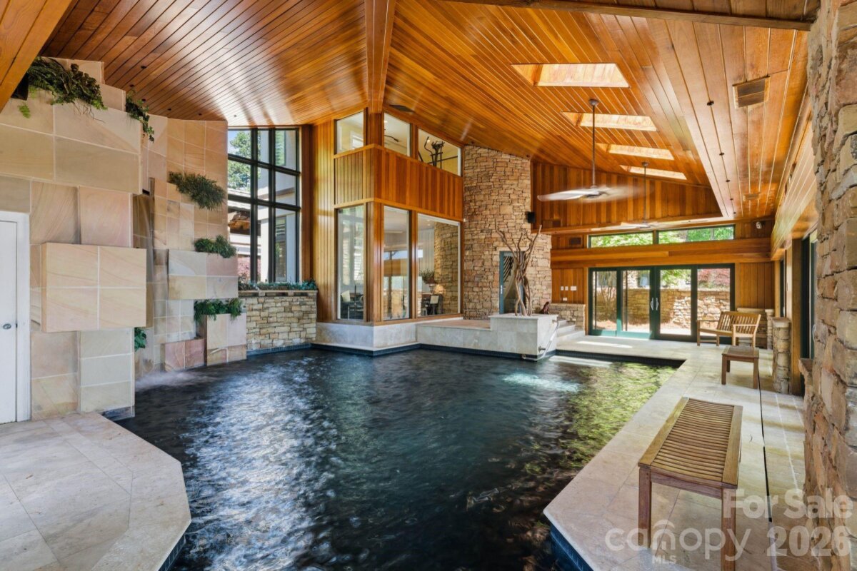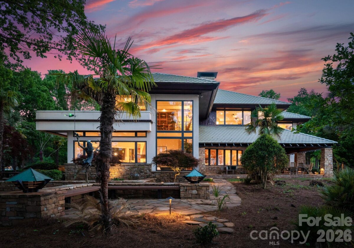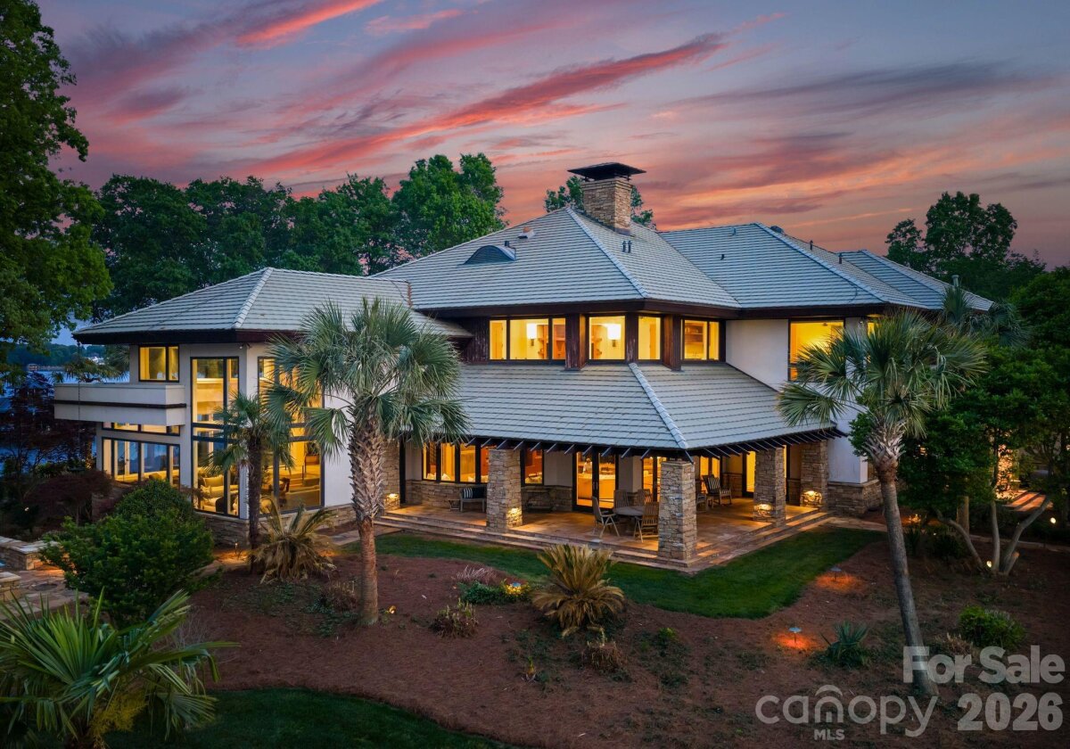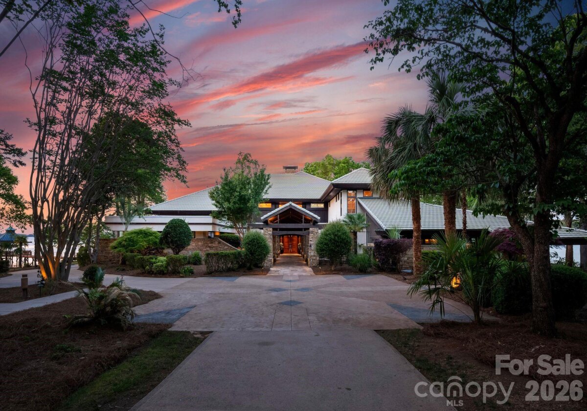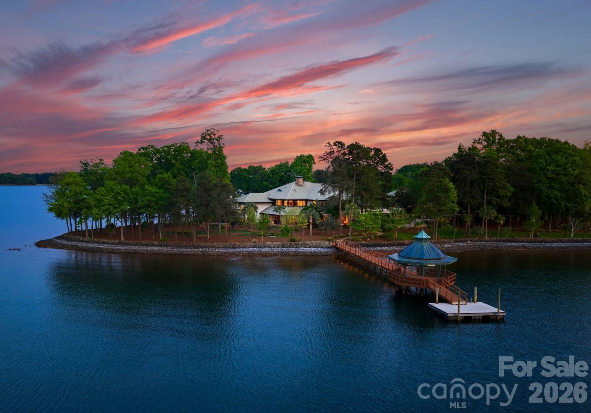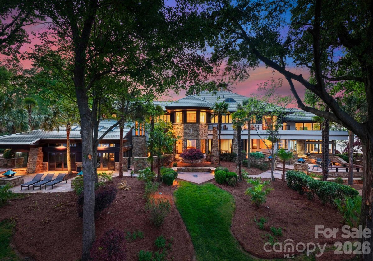 Designed by renowned architect Harry Schrader, Merancas Island is an extraordinary private island standing as one of the most significant residential offerings ever to come to market in the Carolinas. Spanning 4.5 pristine acres along Lake Norman’s shoreline, this estate delivers a resort lifestyle with no equal. Custom architectural details, bespoke lighting, and timeless design define every corner of the 14,317-square-foot residence. A gated entry winds through lush tropical grounds past palm trees, sculpture gardens, the guest house, and tennis court before arriving at the primary residence, where breathtaking lake views greet you from every room. A covered pavilion entry path flanked by a tranquil pond leads to curved doors with elegant colored glasswork, opening into a foyer of immediate distinction. Soaring 20-foot ceilings and a refined stone fireplace set the tone for the craftsmanship found throughout. Elevator access to the upper level and attic is positioned just off the entry hall. The great room is the heart of the home, featuring a 25-foot ceiling, lake views on three sides, and expansive windows that dissolve the boundary between interior and exterior. A gas fireplace anchors the space as doors flow out onto multiple patios overlooking the water. The kitchen features a generous island, gas cooktop and ovens, granite countertops, and a full butler's pantry, all complemented by a sunny breakfast area with lake views. The dining room offers architectural ceiling details, a stone fireplace, and a custom light fixture by Schrader, with direct access to a screened outdoor patio. A dedicated wine room with stone finishes, custom racks, and glass display cabinetry sits nearby. One of the home's most remarkable amenities is the enclosed indoor pool, clad in Tennessee Field Stone and cedar walls beneath a cedar ceiling with skylights and integrated plant walls. A full bath with sauna complements the pool area. Adjacent, a sun-filled flex room with plantation shutters and a glass wall peering into the pool space serves equally well as a bonus guest suite, office, or playroom. A private executive office features custom built-ins and a sliding panel connecting to the crafting room beyond, a generous creative space anchored by a large center island. Additional main-level spaces include a storage room, a full bath, a powder room, and a drop zone from the three-car garage. The upper level is anchored by the exceptional primary suite, featuring a custom platform bed with integrated bookshelves, a fireplace, and a hidden bookcase door that opens to a reading loft with a spiral staircase to the great room, making this space genuinely one of a kind. The primary bath offers dual vanities, a soaking tub, a custom stone and wood shower, and two walk-in closets with glass display cabinets. A private terrace overlooks the water from the bedroom. Two guest bedrooms offer lake views and an ensuite bath, served by an additional shared hall bathroom. The theater room delivers a full entertainment experience with a pool table, wet bar, and projector system. The children's playroom is a world of its own, a hand-painted mural wraps the walls and ceiling, built-in beds with trundles, and an adjacent wet room handles every art project and lake-day cleanup with ease. The guest house offers a recently updated retreat with an open-concept living and kitchen area, two bedrooms, a shared bath, and its own three-car garage. Outside, stone walkways wind through the island, past a fenced tennis court, two docks with boat lifts and a covered gazebo, a sandy private beach, a shed, and a dog run. Ideally situated less than 30 minutes from Uptown Charlotte with convenient access to major roadways, Merancas Island places you at the heart of everything Lake Norman has to offer, from world-class dining, boating, waterfront recreation, to a vibrant social scene. This is lake living at its absolute finest.