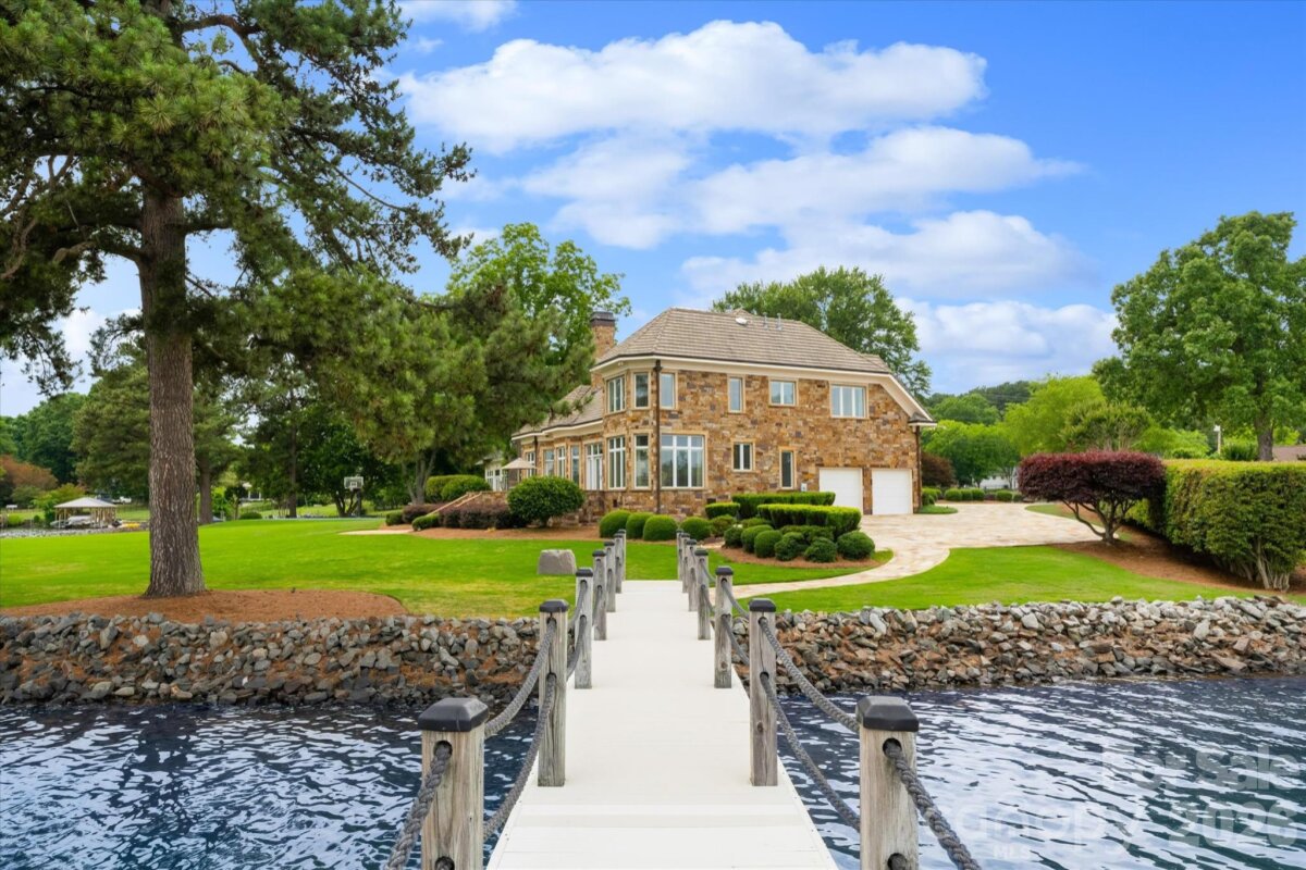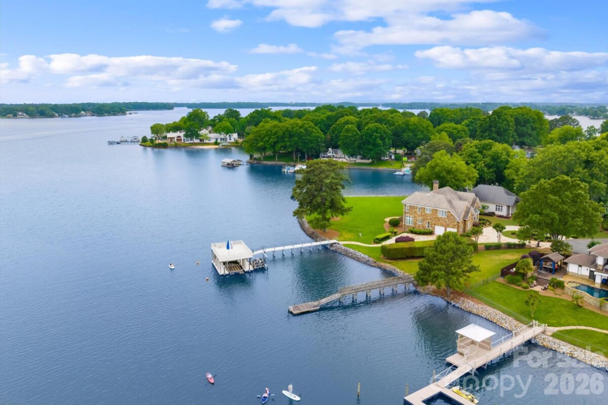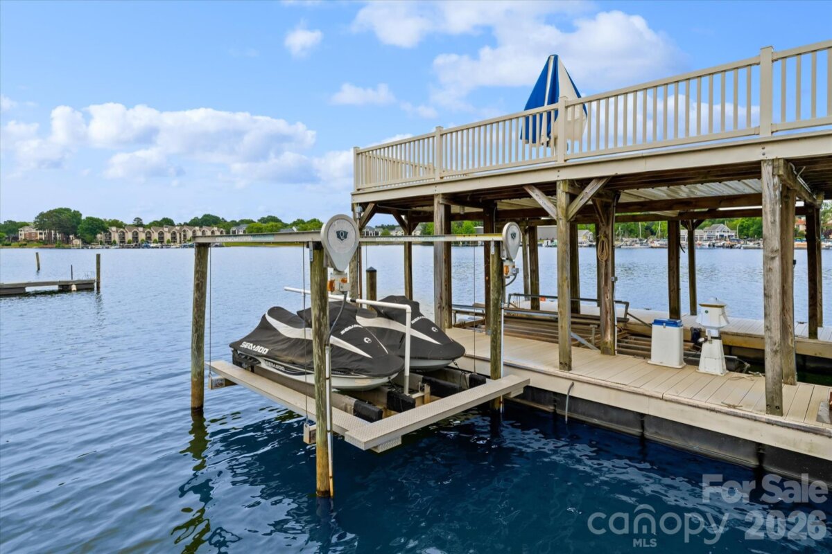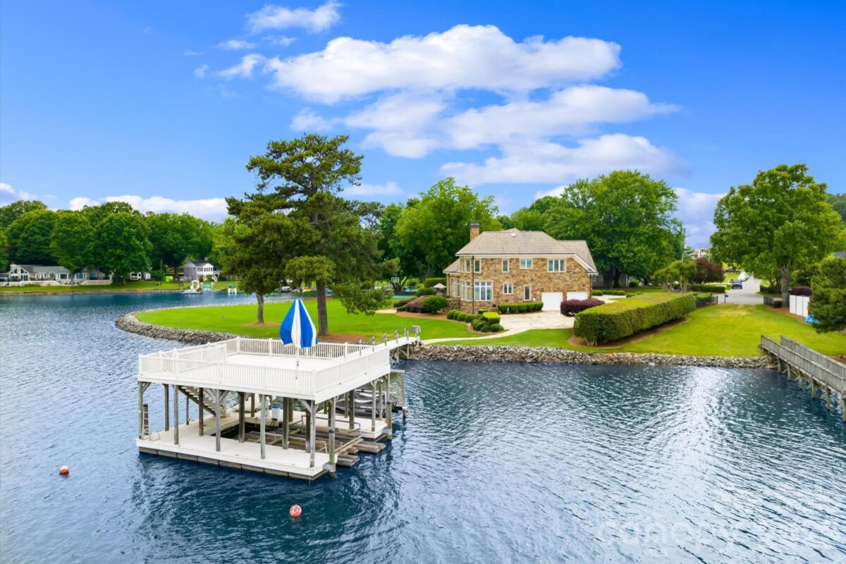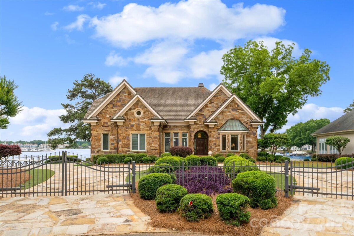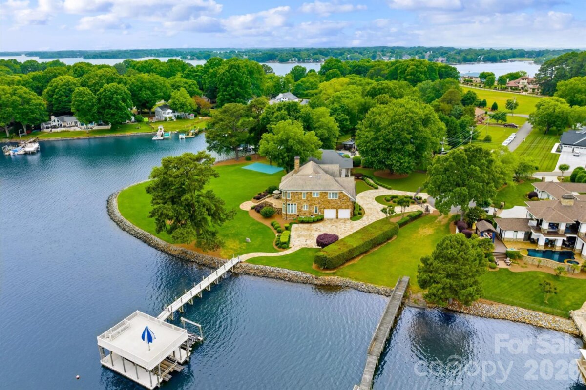 Positioned along a pristine shoreline on Lake Norman, this gated waterfront property offers a rare sense of scale, privacy, and uninterrupted water views. Set within a quiet cul-de-sac in Cornelius, the setting feels both tucked away and highly convenient—without HOA restrictions. The residence is thoughtfully designed to maximize its connection to the lake, with expansive living spaces and large-scale windows that frame the water from nearly every vantage point. Each bedroom features its own private ensuite, offering comfort and privacy for both residents and guests. Interior finishes reflect a warm, timeless aesthetic, including cherry wood flooring and cabinetry, Pella windows, and custom craftsmanship throughout. The waterfront experience is elevated by a distinctive double-decker dock, featuring a covered boat slip with lift below and an upper-level platform ideal for lounging, entertaining, or taking in the panoramic lake views. In addition, a dedicated lift accommodates two personal watercraft, creating a seamless setup for lake living. A separate guest house and additional lot are available for purchase, presenting an opportunity to further expand the estate if desired. A distinctive Lake Norman offering that combines privacy, craftsmanship, and an exceptional waterfront setting.