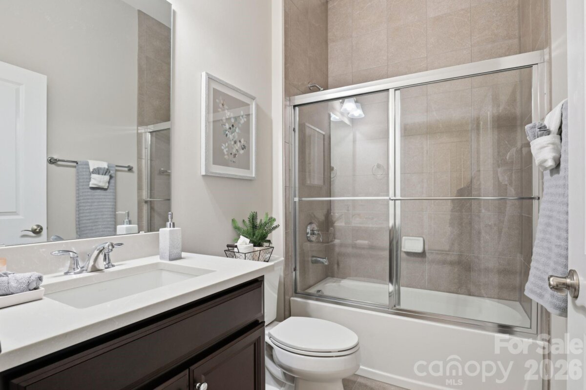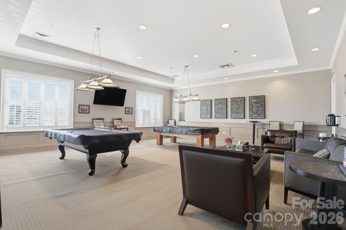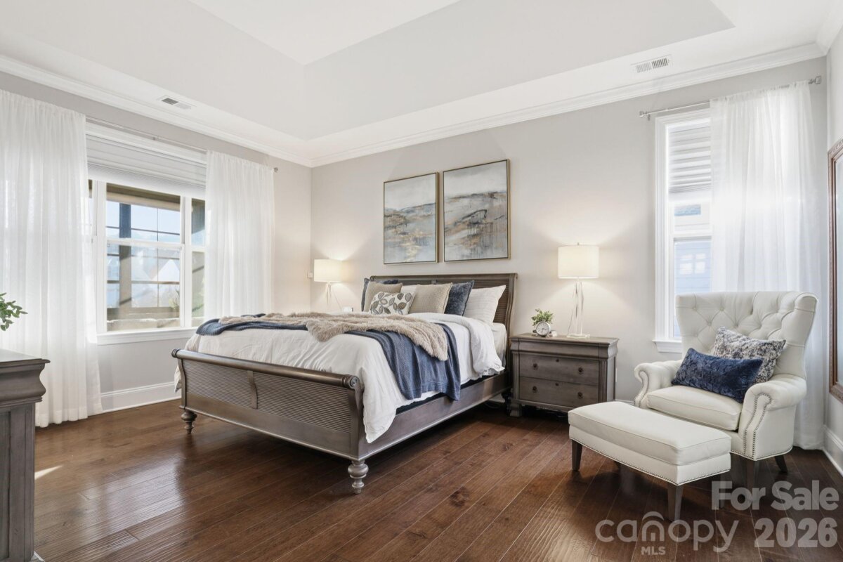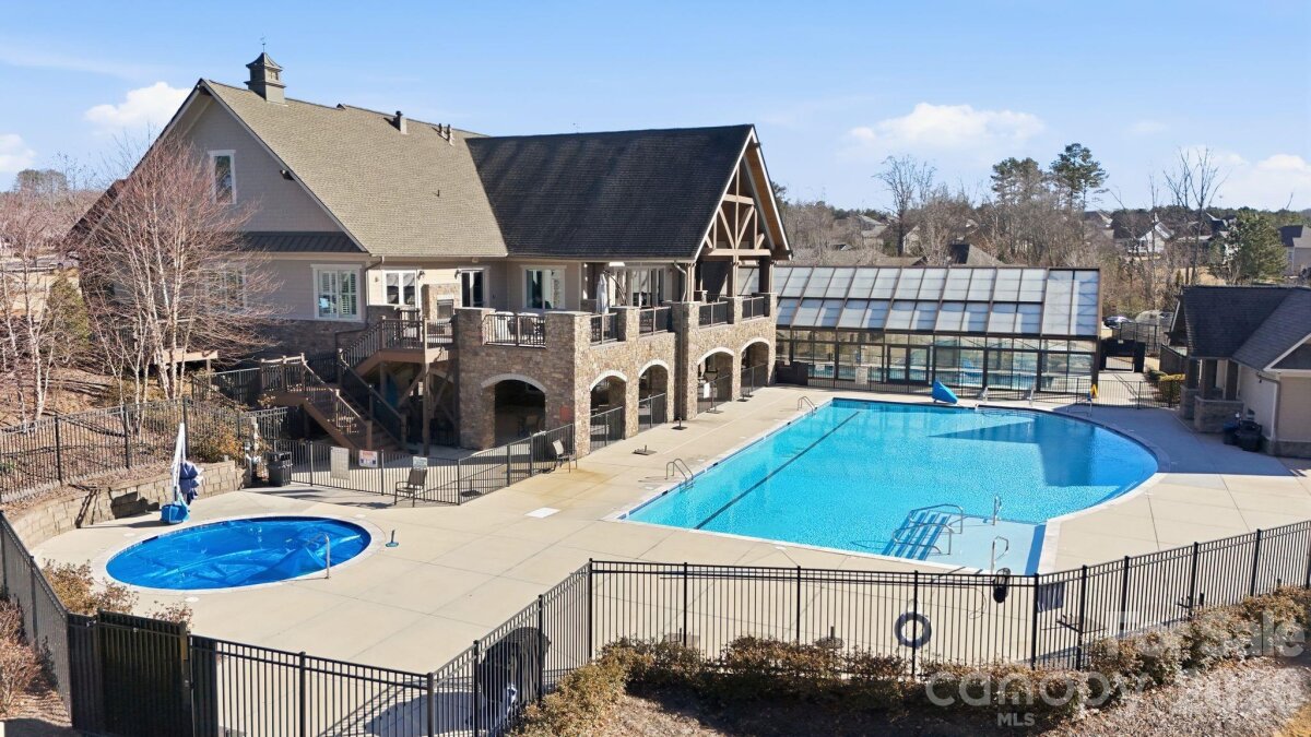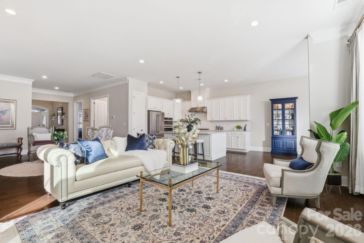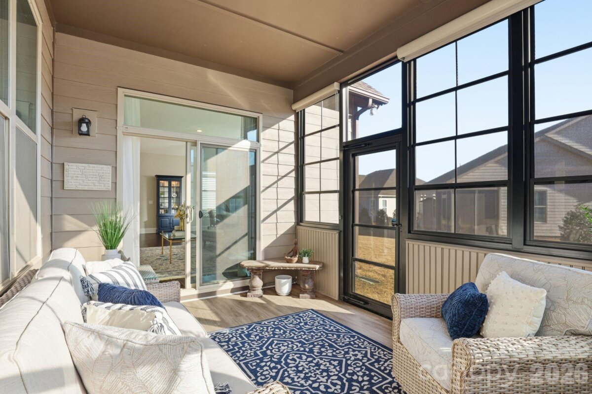 Experience elegant, low-maintenance living in the coveted Regency at Palisades, a premier lifestyle community just minutes from the shores and recreation of Lake Wylie. This thoughtfully designed home impresses from the start with stacked stone veneer, durable fiber cement siding, a pergola with architectural corbels over the 2-car garage, and a professionally landscaped yard accented with premium plantings and river rock. Inside, a welcoming foyer with volume ceilings sets the tone for the refined finishes found throughout. Enjoy 10-foot ceilings, 8-foot interior doors, detailed architectural trim, plantation shutters, designer lighting, and rich hand-scraped hardwood floors in every living area and bedroom. The spacious family room is filled with natural light and opens effortlessly to an additional flex space and an enclosed porch offering year-round enjoyment, ideal for relaxing mornings or entertaining guests. The chef-inspired kitchen is both beautiful and functional, featuring crisp white cabinetry, quartz countertops with an upgraded ogee edge, stylish tile backsplash, gas cooktop with KitchenAid hood, built-in oven and microwave, single-bowl porcelain sink, and a large island with cabinetry on both sides for exceptional storage. The adjacent dining area adds convenience for everyday living and gatherings. The primary suite is a serene retreat with tray ceiling, crown molding, hardwood flooring, and a spacious walk-in closet. The spa-inspired primary bath offers a garden tub, tiled shower with frameless glass enclosure, quartz countertops, and a linen closet. Secondary bedrooms provide flexible options for guests, home office, or hobbies, supported by a beautifully finished secondary bath. The study/third bedroom offers flexibility and can easily accommodate permanent or fixed closet storage, if desired. A dedicated laundry room includes cabinetry and a utility sink for added convenience. Residents of Regency at Palisades enjoy resort-style amenities including a clubhouse, indoor and outdoor pools, fitness center, tennis, pickleball, and bocce ball courts, scenic walking trails, and an active social calendar curated by a full-time lifestyle director. HOA includes lawn maintenance and irrigation from the community well. Ideally located near Lake Wylie and just minutes from The Palisades Country Club for golf. This home offers an exceptional blend of luxury, comfort, and vibrant lifestyle living.