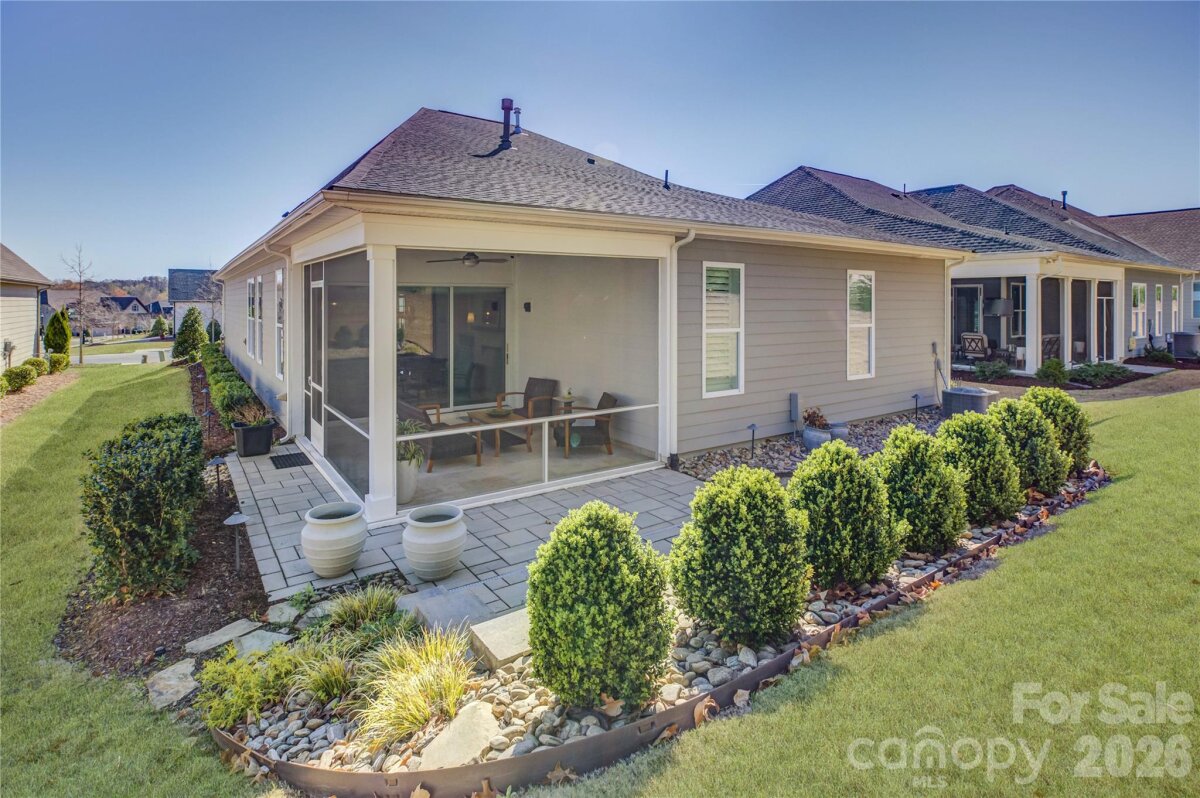 Located in the amenity-rich Regency at Palisades neighborhood, this meticulously maintained home is filled with thoughtful upgrades and custom details that make it a true standout. A striking custom steel front door welcomes you into an interior adorned with rich wood flooring, custom plantation shutters, and designer drapery panels throughout. Just off the entry, a private study or formal living room offers a quiet retreat. The open-concept layout seamlessly connects the gourmet kitchen, dining area, and living room, creating an ideal space for everyday living and entertaining. The stunning kitchen features crisp white cabinetry, a large prep island with a single-bay sink, a gas cooktop, a wall oven, an eye-catching tile backsplash, and beautifully customized pantry and butler’s pantry cabinetry. Sliding glass doors with a remote-controlled blind lead to a screened porch with cool travertine flooring, perfect for year-round enjoyment, overlooking a stone patio and a backyard enhanced with tasteful garden lighting and French drains. The oversized primary suite is a serene escape with a tray ceiling, dual vanities, a glass-enclosed tiled shower, and an impressive custom closet. A well-appointed laundry room with a utility sink, folding counter, and additional custom cabinetry makes daily tasks a pleasure, while two spacious secondary bedrooms share a hall bath. This exceptional home blends comfort, function, and elegance in every detail.