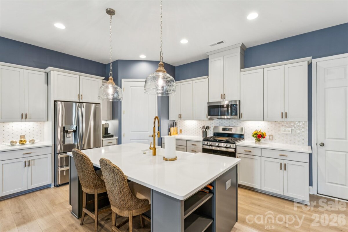Nestled in the North Reach community within The Palisades, this 3-bedroom gem is beautifully curated, and every space feels intentional. The open layout creates a seamless flow between living areas. Anchoring the heart of the home is an expansive chef-inspired kitchen with gas range, upgraded gold fixtures and huge entertainers dream island. Retreat to the primary suite with a spa-inspired bath with dual sinks, oversized separate glass-enclosed shower with built-in bench and huge floor-to-ceiling closet. Additional bedrooms offer comfort and ample capacity to suit a variety of needs. Designed with flexibility in mind, the upstairs bonus area offers impressive scale and versatility, accommodating everything from a stylish office for remote work, a home theater, recreation, or a secondary living area. Clever storage solutions with an unfinished area easily accessed from the bonus room gives you room for everything. A 2-car garage features epoxy-coated flooring and plenty of storage. Outside your yard features an irrigation system and perefectly sized yard where the lawncare is included in your HOA! HOA includes tennis, pool, gym, clubhouse, & more--just minutes from Lake Wylie, shopping, dining, and entertainment. A Social membership to the Palisades Country Club is included in the HOA. North Reach neighborhood has access to The Lake House