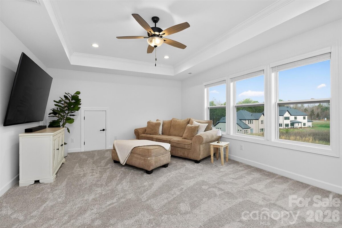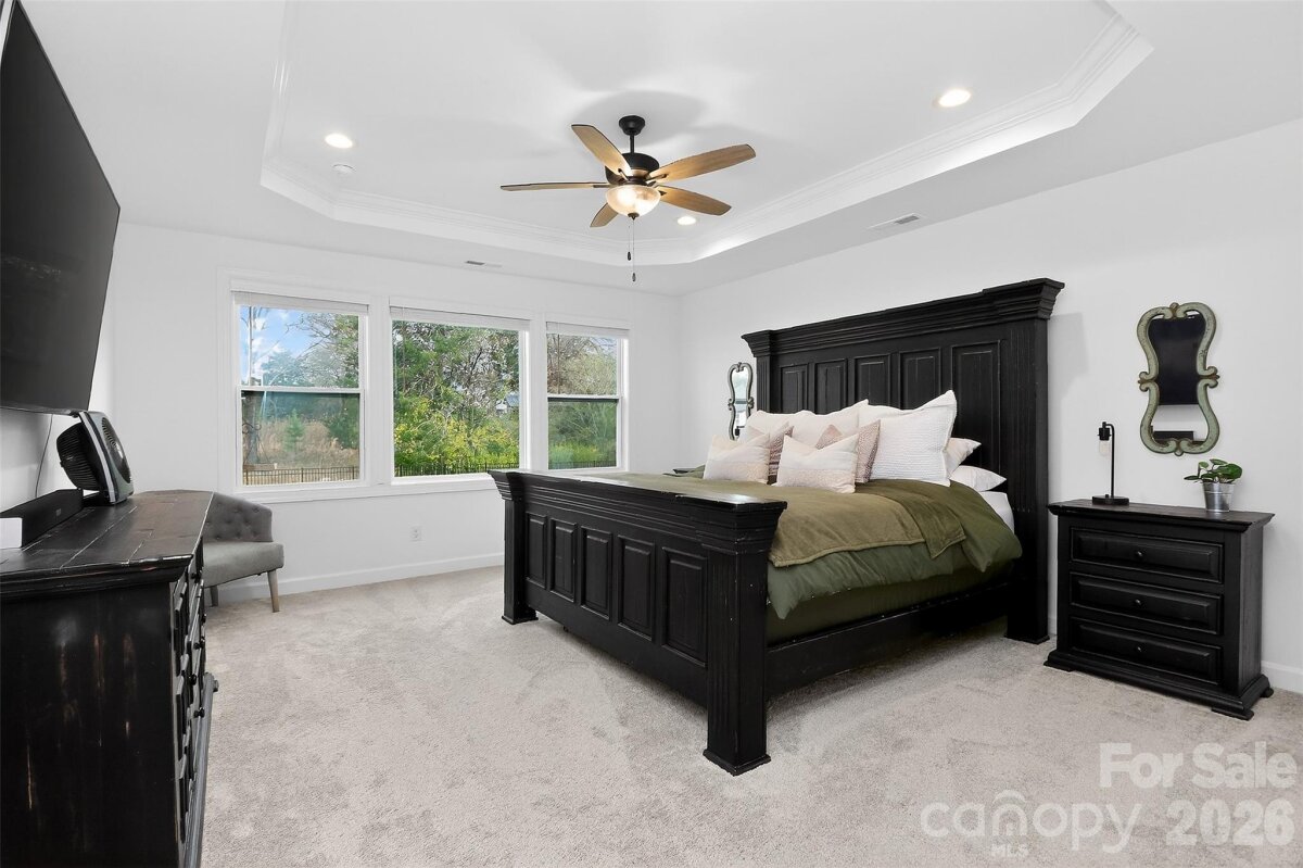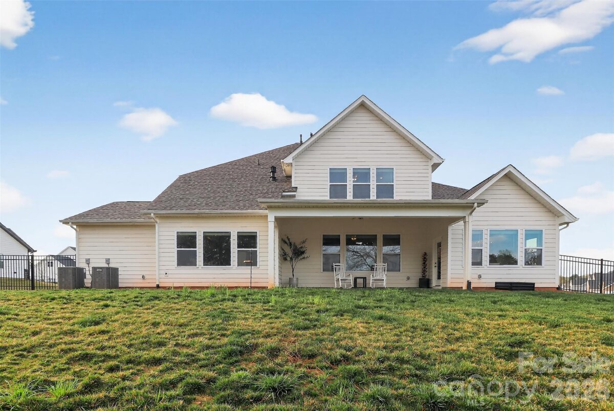 Enjoy the feel of new construction in this beautifully maintained one-year-old Craftsman-style home set on a .60-acre homesite backing to mature trees, offering a private setting and peaceful views from the covered rear porch. A soaring two-story foyer welcomes you and leads to the dining room with a dramatic 12 ft ceiling and arched entry. The open kitchen features quartz countertops, a large island, soft-close cabinetry, and stainless-steel appliances, flowing seamlessly into the family room with a gas fireplace and built-in cabinetry. The main-level Premier Suite includes a tray ceiling, walk-in closet, and spa-like bath with soaking tub and tiled shower. A guest bedroom on the main level provides flexibility for visitors or a home office. Upstairs offers a loft with built-in desks, a spacious recreation room, and additional bedrooms, including one with a private bath. The current owners have completed several thoughtful enhancements, including landscaping with sod and plantings, a fenced backyard, irrigation system, and window treatments throughout, adding to the home’s move-in-ready convenience.
