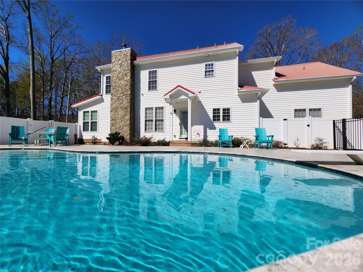 Custom Farmhouse in Mt Holly, NC. Private setting with amazing outdoor spaces. Stunning wrap around front porch with composite decking overlooking a serene wooded area adorns the front. The back features a show stopping resort quality inground pool complete with outdoor lighting, ReVamp concrete coating in both the pool area (as well as the garage), adjustable cascading waterfalls, knee ledges, and a beautiful built-in outdoor fireplace. The pool area is fenced with tasteful black aluminum fencing while the side yard features a separate fenced pet area. Immaculate interiors spotlighting well over 3000 sq ft. Hardwood floors, supreme chef’s kitchen with oversized island and walk-in pantry, main floor bedroom/flex space, separate living room, family room, office, and 17 ft sunroom room all on main. Home features 3.5 baths. Upstairs you will find the expansive primary suite up along with 2 additional bedrooms, loft and bonus room. No HOA, no city tax, 0.68 acres, spacious workshop. This home is a dream, make it your reality! Showings to begin April 1st. Home built 2004. Pool 18x36, built 2022, depth 3.5ft to 8ft. Dual laundry hook-ups on both levels. Metal roof and oversized gutters and downspouts.