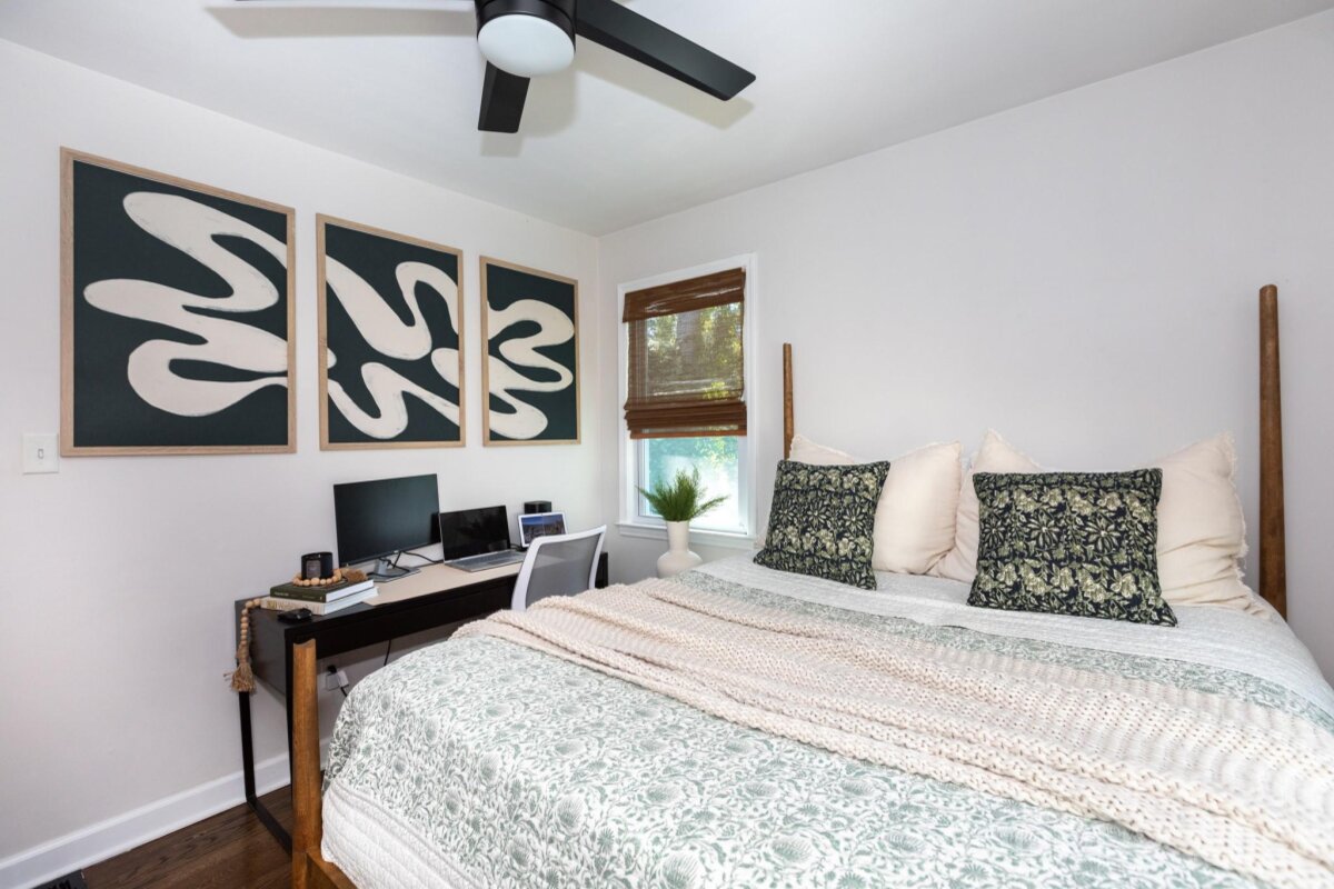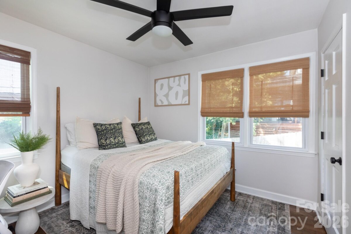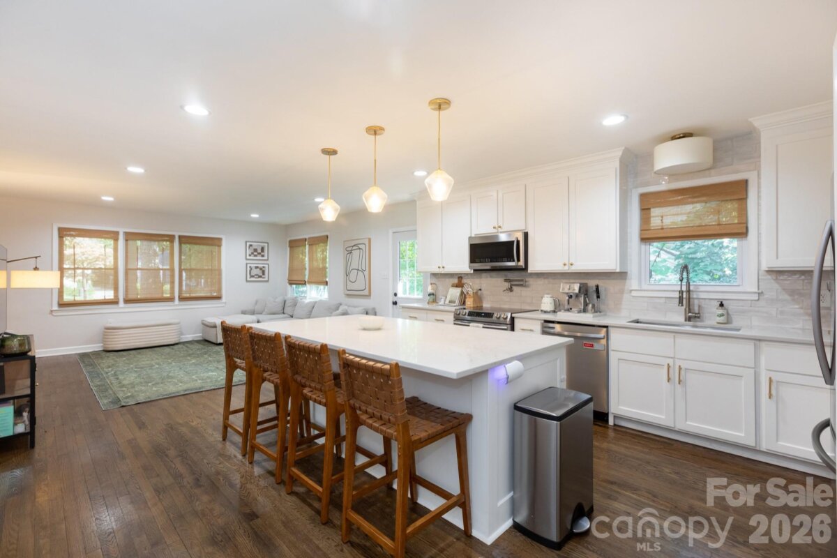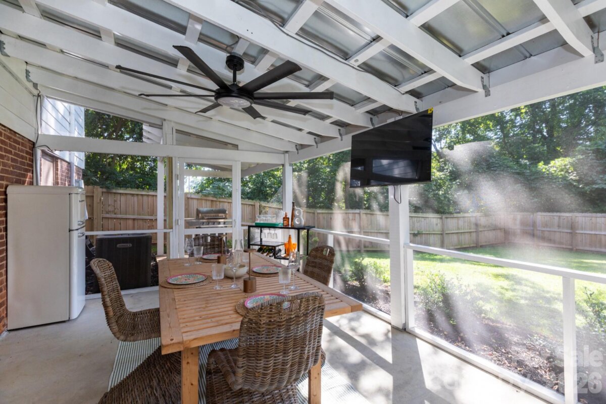 Nestled on a stunning treelined street, this completely renovated 3 bed, 2.5 bath ranch is convenient to Uptown and a short walk to Veterans Park and all that Plaza Midwood has to offer! You'll want to stop and relax on the covered front porch with maintenance free composite decking. A new gutter system and roof featuring lifetime architectural shingles were installed in fall of 2025. Inside, you will step into a large foyer where a drop zone welcomes you into the extensive laundry room with storage, storage, storage! All new vinyl insulated windows allow the home to fill with natural light. The open floor plan flows from the large great room into the custom built, modern kitchen with large island, quartz countertops with seating for 4, stainless steel appliances and a pantry. Refinished original hardwood flooring flows throughout the home. The Owner's suite includes a private deck with sliding glass doors, an updated bath with double vanity, tile shower, and an expansive walk in closet with a custom built organization system. An additional bedroom includes a 1/2 bath ensuite with original tile flooring. The final bedroom has been updated with crown molding and wainscoting. Stairs off the kitchen lead to the grilling deck and large screened in porch overlooking the fully fenced in, private .2 acre yard with beautiful cottage style gardens. The unfinished basement has plenty of additional storage space with a large work bench and was recently updated with ceiling insulation and vapor barrier installed in crawlspace. Home Owner will complete additional improvements to basement framing and the original foundation to comply with Structural Engineer's finding prior to closing. Per Previous Owner: home was partially damaged by fire and was rebuilt in 1982.