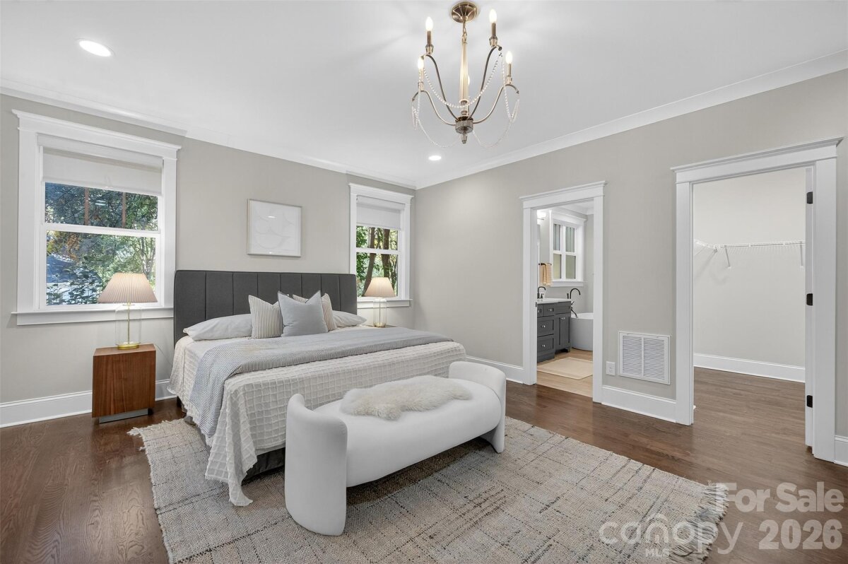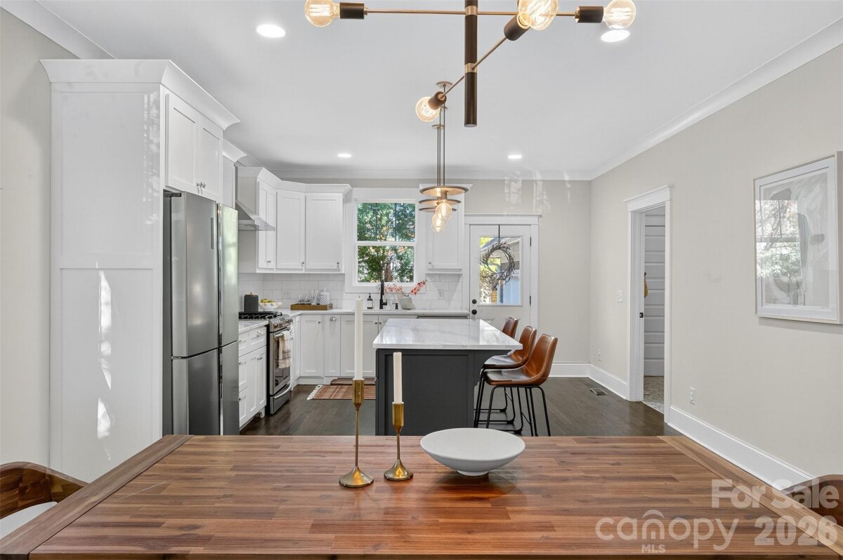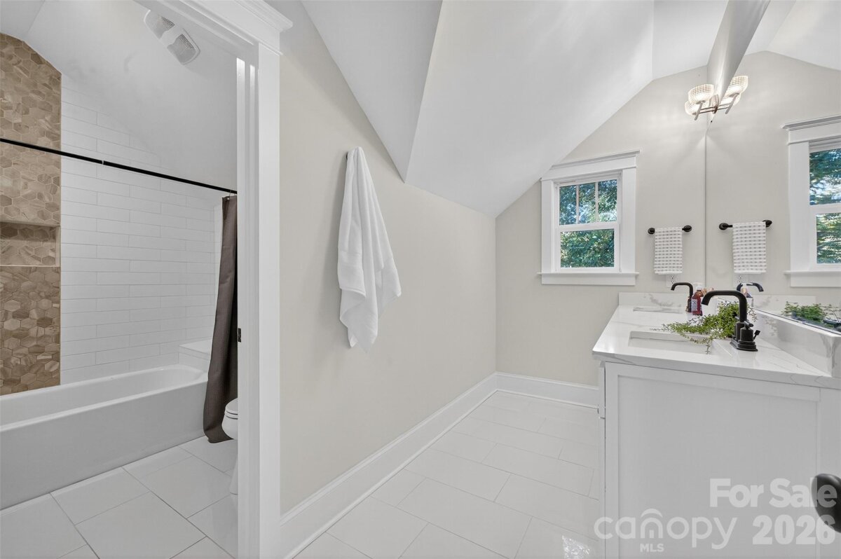Stunning 2020 custom Craftsman in the heart of Midwood, just steps from NoDa and Central Ave! This home perfectly blends modern comfort and design, featuring an open floor plan ideal for entertaining. The gorgeous kitchen offers a large island, handcrafted cabinetry, quartz countertops, gas range with hood, stainless steel appliances, and overlooks the light-filled living room with a beautiful gas fireplace. The primary suite is conveniently located on the main level, complete with a spacious sitting area, spa-like bath featuring a freestanding tub, frameless glass shower with dual shower heads, double vanity, and custom walk-in closet. A main-level laundry room with drop zone adds everyday convenience. Upstairs, you’ll find a bright loft area perfect for an office or lounge, three generous bedrooms, a full bath, and an additional laundry room. Additional highlights include site-finished hardwoods throughout, dual HVAC, on-demand hot water, sealed crawl space, large fenced backyard, and an attached two-car garage with circular front drive. The perfect home in the perfect location—truly one of a kind!