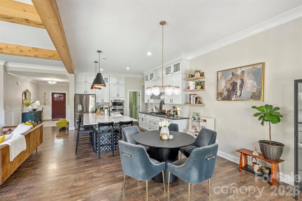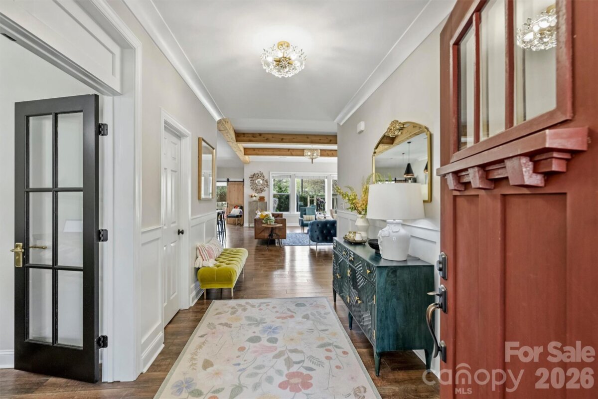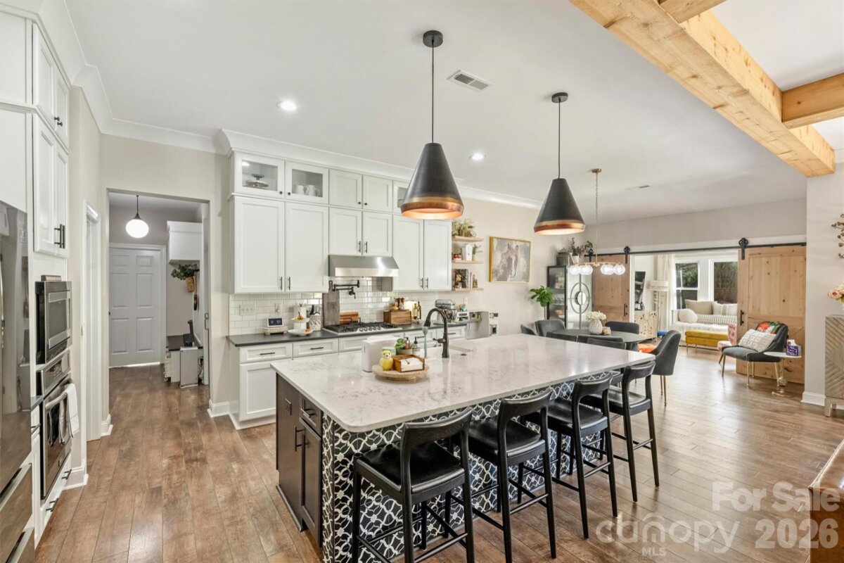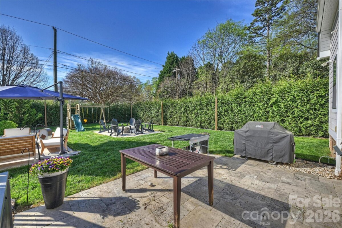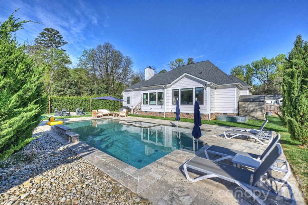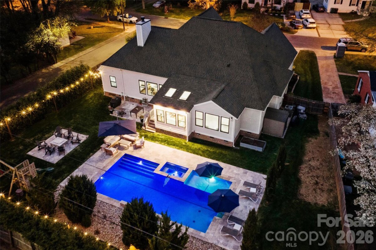 Rare opportunity to own a single-story, newer construction home on a corner lot in the highly sought-after Merry Oaks neighborhood—just minutes from Plaza Midwood, NoDa, and Uptown. Situated on a spacious lot, this property offers a private backyard retreat complete with a pool and spa combo, stone fire pit, patio and terrace, and full fencing—perfect for relaxing or entertaining. Inside, the thoughtfully designed floor plan features a stunning great room with wood beam ceiling accents and a cozy wood-burning fireplace, all overlooking the backyard oasis. Durable, classic wood-look LVP flooring runs throughout the main living areas. The chef’s kitchen is both functional and beautiful, equipped with a gas cooktop, pot filler, wall oven, stainless steel appliances, farmhouse sink, oversized island, and a butler’s pantry with additional sink and prep space. The spacious primary suite offers a private retreat with double walk-in closets, dual vanity bath, oversized walk-in shower, water closet, and a versatile attached flex space—ideal for a second office or private drop-zone. A secondary bedroom with en-suite bath provides comfort and privacy for guests or family. Additional highlights include a 2-car attached garage, drop zone with built-in bench, and a generously sized laundry room with sink and cabinetry. This rare combination of modern construction, single-level living, and prime location makes this home truly stand out in Merry Oaks.