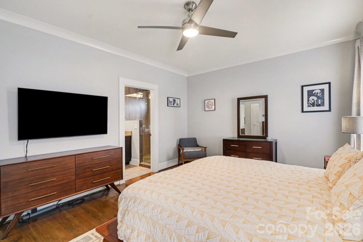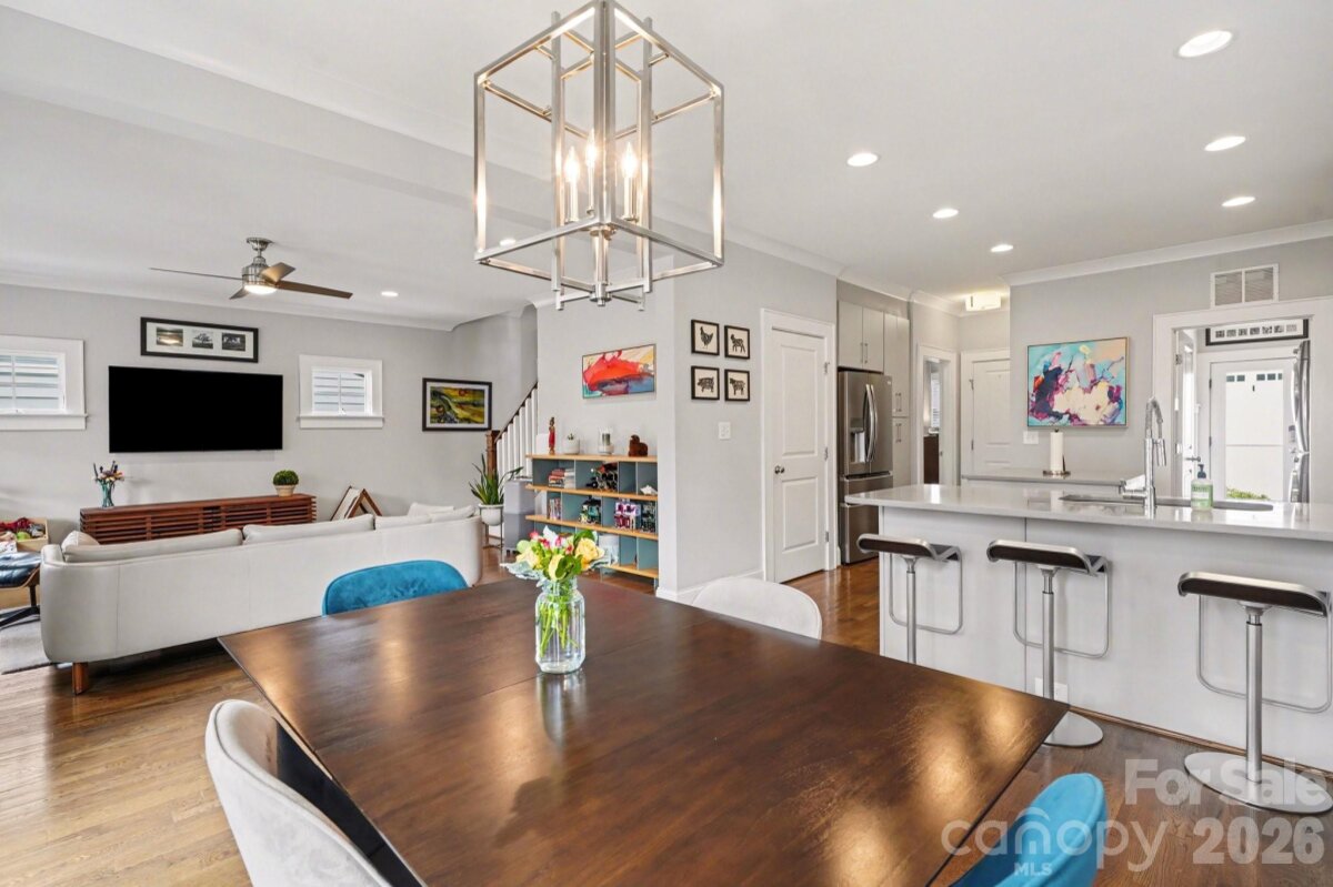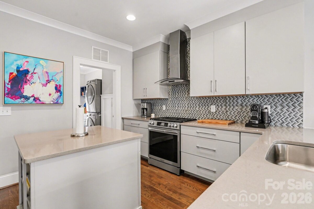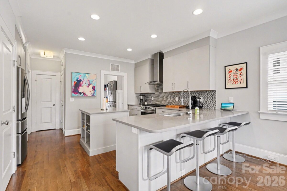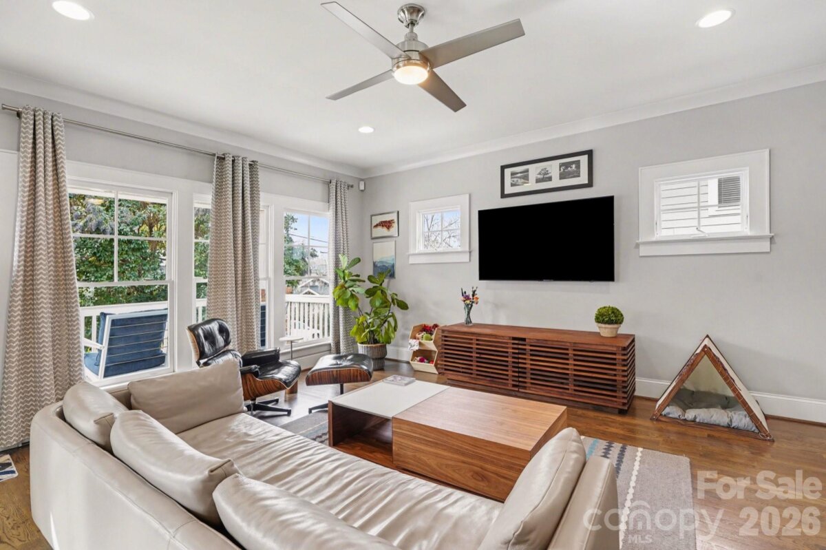 One-owner "modern bungalow" (built in 2014) located on the edge of Uptown Charlotte in the popular Belmont neighborhood. Meticulously maintained and improved, the house shows beautifully with site-finished, real wood floors throughout. Abundant natural light floods the open-floor kitchen/dining/living downstairs, including powder room. Perfect for entertaining, the floorplan flows effortlessly to lovely outdoor spaces -- to the covered front porch and onto the back patio and fenced rear-yard, with in-ground irrigation. Primary ensuite bedroom with generous closet (built-ins) is also located downstairs. A gorgeous, wooden stairway is tucked away and leads to upstairs with two large bedrooms, sharing a full, hallway bath; the 2nd level also offers a flex/office area and ample storage. Electric driveway gate and detached 2-car garage offer security and additional storage as well. Ideally located between Uptown Charlotte and Plaza-Midwood just two short blocks from the Sugar Creek Greenway, 7-minutes to the light rail, and walking distance to Optimist Hall, Urban District Market, breweries, restaurants, coffee shops, and parks. The home offers fantastic views of the Queen City skyline, best enjoyed from the Southern, covered front porch.