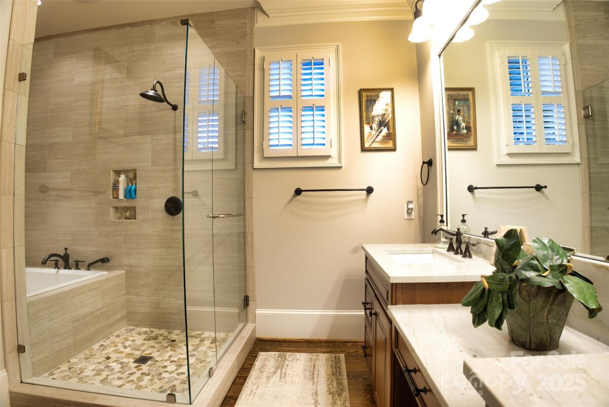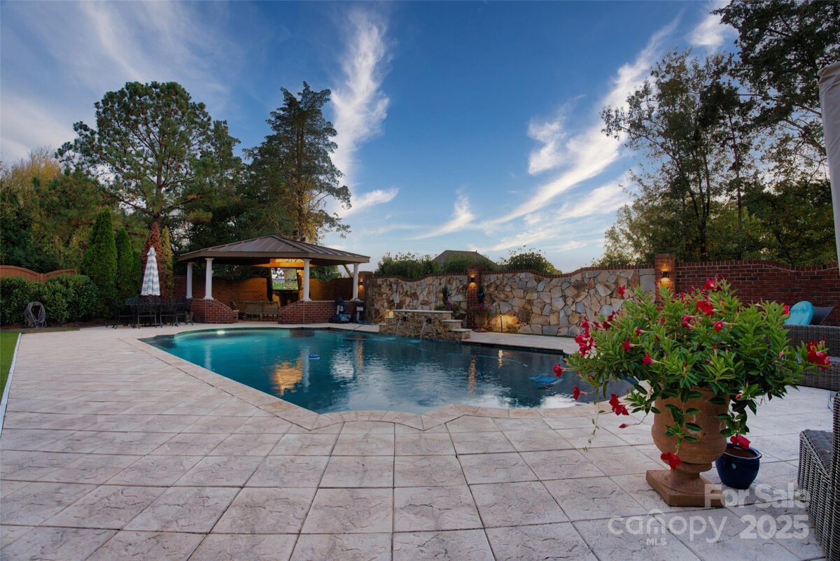 Flawlessly renovated from top to bottom, this all-brick South Charlotte residence embodies timeless elegance and modern luxury. Offering over 4,500 square feet of curated design, this 5-bedroom, 4.5-bath home seamlessly blends craftsmanship, warmth, and functionality in every space. The newly reimagined chef’s kitchen anchors the main level with custom inset cabinetry in soft white and rich walnut, complemented by Calacatta Laza quartz countertops, a premium surface prized for its luminous veining and marble-like depth. A hand-crafted wood-tone range hood, brass fixtures, and designer pendant lighting create a magazine-worthy focal point, while top-tier stainless steel appliances complete the space. Wide-plank site-finished oak flooring flows throughout, accenting layered crown moldings and millwork that give each room a refined architectural presence. The primary suite feels like a boutique spa with its own transformation: Statuario Venato porcelain slab shower walls, Calacatta Laza quartz vanities, brushed-gold fixtures, a freestanding soaking tub, and a custom walk-in closet fitted with soft-close built-ins and brass hardware. Two additional fully renovated bathrooms mirror the same caliber of design, each featuring stone-top vanities, updated lighting, and seamless tile work. Upstairs, the bonus suite has been elevated into a genuine destination for entertaining. With a wet bar wrapped in emerald granite, a wine refrigerator, and a massive open footprint, it’s an ideal space for billiards, theater seating, or game-day hosting. Both the bar/game room and guest suite with French doors open to a private balcony overlooking the resort-style pool, perfect for those tranquil morning coffee or late night glass of wine views. Step outdoors to discover your personal retreat: a salt-water pool surrounded by travertine-pattern porcelain decking, a built-in outdoor kitchen with grill, sink, refrigerator, and mounted TV, and a gazebo lounge with a second TV for game nights under the stars. The lush backdrop of brick and natural stone privacy walls completes the feeling of an exclusive resort. Additional highlights include dual new HVAC systems (up and down), a new double front door making a bold first impression, updated fixtures throughout, and designer touches that elevate every square foot. Perfectly positioned in the coveted Olde Providence South community, this home offers premier access to SouthPark, Arboretum dining and retail, and top-rated schools. Every upgrade is complete; simply move in and live the lifestyle of effortless luxury and refined Southern charm.