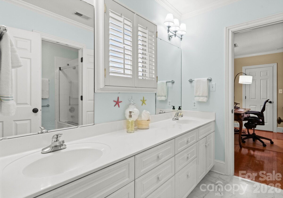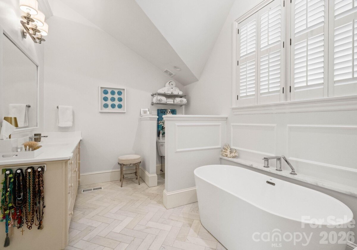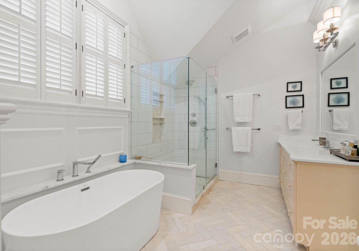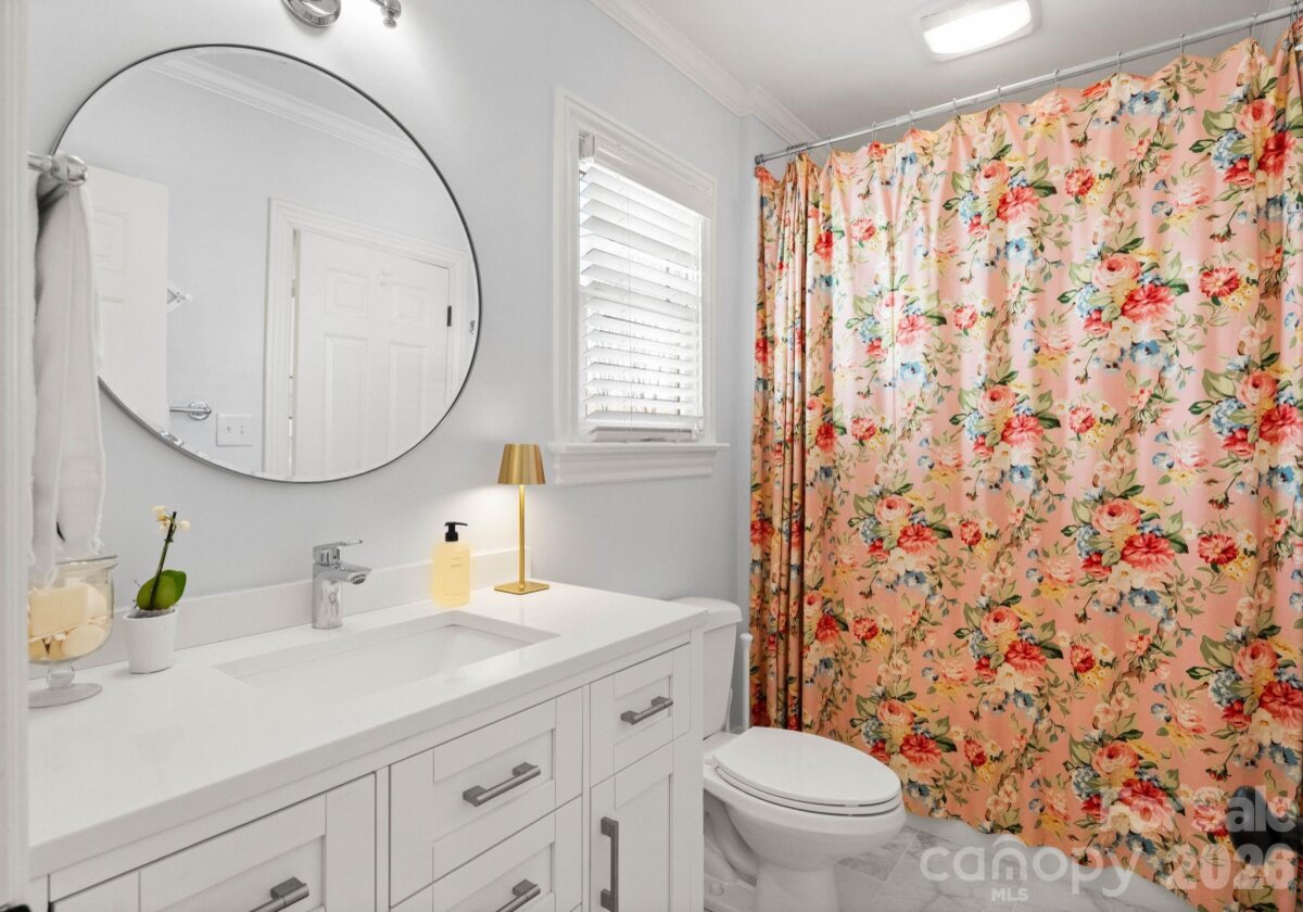 Welcome to this classic traditional home filled with natural light, charm, and style. A welcoming foyer off the covered front porch is flanked by formal living and dining rooms, leading into a stunning two-story great room with fireplace and built-ins that seamlessly opens to the updated kitchen with high end appliances, large island, wet bar walk in pantry and breakfast area. The main-level primary suite features dual walk-in closets and a spacious, updated bath. A convenient laundry room with sink is located just off the attached garage. Enjoy year-round living on the inviting screened porch with oversized shutters, which opens to a wooden deck overlooking a beautifully manicured, private, fenced backyard. Upstairs, two staircases lead to four additional bedrooms, two full baths, an oversized yet cozy bonus room, and a versatile rec space perfect for a home gym or playroom. Ideally located in a sought-after neighborhood close to SouthPark, shopping, dining, and top-rated schools.