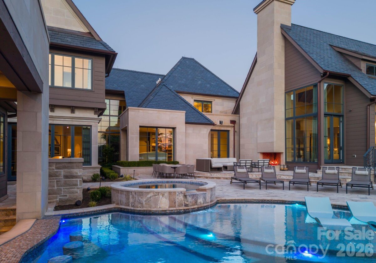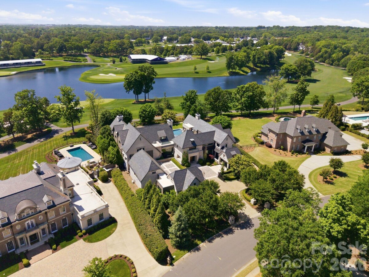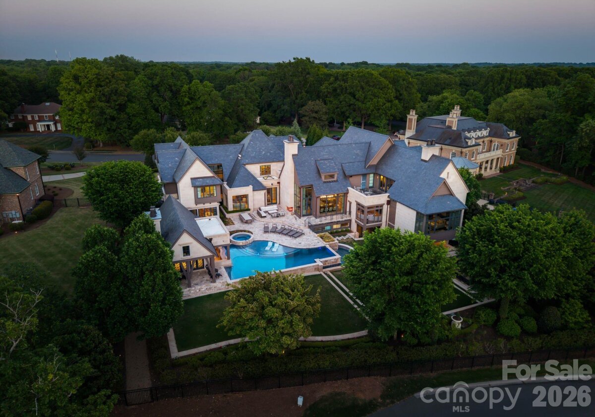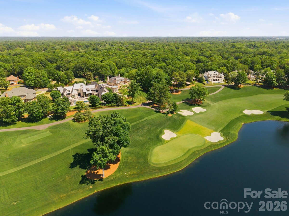 Set along the championship fairways of Quail Hollow Club, host to the city's most prestigious PGA tournaments, 7318 Baltusrol Lane is one of the most exquisite custom homes ever offered in Charlotte. Encompassing 17,843 square feet of heated and cooled living space, this 6 bedroom, 6 full bath, and 6 half bath estate was built in collaboration with architect Harry Schrader, Arcadia Homes, and J Layton Interiors. Clad in 4" hand-cut limestone and framed by lush landscaping and lighting, the estate's exterior commands immediate reverence. A grand porte-cochère anchors the gated motor court, opening to two garages with custom cedar doors. The main level opens through a 10' custom entry door into a dazzling foyer dressed in Pierre Frey fabric wall upholstery with dual hidden doors concealing a powder room and a walk-in coat closet. A dedicated library off the foyer features architecturally designed shelving and sweeping views of the backyard. Just beyond the foyer, the great room rises to 21-foot ceilings with custom wood detailing and skylights, anchored by a limestone-surround gas fireplace and a hand-blown glass chandelier over a Hellman Chang dining table set. Flowing between the great room and kitchen, the bar area is appointed with marble countertops and seating for five, a built-in Wolf coffee system and display shelving. The chef's kitchen features full-height marble countertops and backsplash, a Wolf and Sub-Zero appliance suite, and Wood Mode full-inset cabinetry, supported by a fully equipped scullery with a commercial-grade walk-in refrigeration and dishwasher. The primary suite occupies its own private wing, offering a true sanctuary where 17-foot wood accent ceilings, a rock crystal fixture, and rift-cut oak pivot doors set a tone of quiet grandeur. Expansive windows frame picturesque views over the Quail Hollow course, flooding the bedroom with natural light, while automated shades offer effortless privacy. A hidden door connects privately to the upper-level office and owners' lounge below. The ensuite bath offers heated flooring, a marble shower, two private water closets, dual walk-in closets, and a seamless connection to the laundry room. Accessible from the primary suite and through nano-sliding doors off the kitchen, the screened porch extends the living experience outdoors year-round with ceiling-mounted heaters. The lower level delivers a spa-grade fitness suite with gym, sauna, steam shower, laundry, and private massage room; a Cinematech-designed soundproof home theater with tiered seating, projector, and a fully appointed bar; and a temperature-controlled wine cellar designed to host intimate tastings. The main wing's upper level features a Golfzon simulator room with a custom designed bar area. The adjoining executive office opens to a porch overlooking the fairways, accompanied by a secondary office with private staircase access connecting to the primary suite and lounge below. The guest wing spans two levels, offering five beautifully appointed bedrooms, each with ensuite baths, a dedicated laundry room, and a main-level lounge with backyard access. Outside, the estate unfolds across tiered, fairway-view grounds, featuring the resort-style pool and spa, and swim-up bar, surrounded by multiple patio dining areas, limestone surrounded fireplaces, and a full outdoor kitchen. The pool house features its own entertaining space, patio with a fireplace, powder room, and laundry, while the attached golf cart garage stands ready for direct access to the Quail Hollow fairways via a private gate. Ideally positioned minutes from SouthPark's premier dining, retail, top public schools, private schools, and major roadways, this estate offers the rare combination of a secluded, resort-style retreat within a private, security-patrolled community. Every room, material, and detail reflects a singular, unwavering commitment to craft, permanence, and the pinnacle of luxury living in Charlotte.
